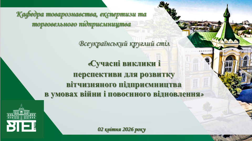 02 квітня 2026 року кафедрою товарознавства, експертизи та торговельного підприємництва у змішаному форматі проведено Всеукраїнський круглий стіл на тему «Сучасні виклики і перспективи для розвитку вітчизняного підприємництва в умовах війни і повоєнного відновлення».