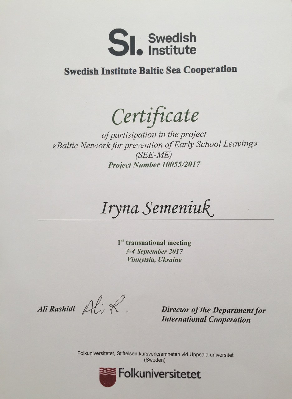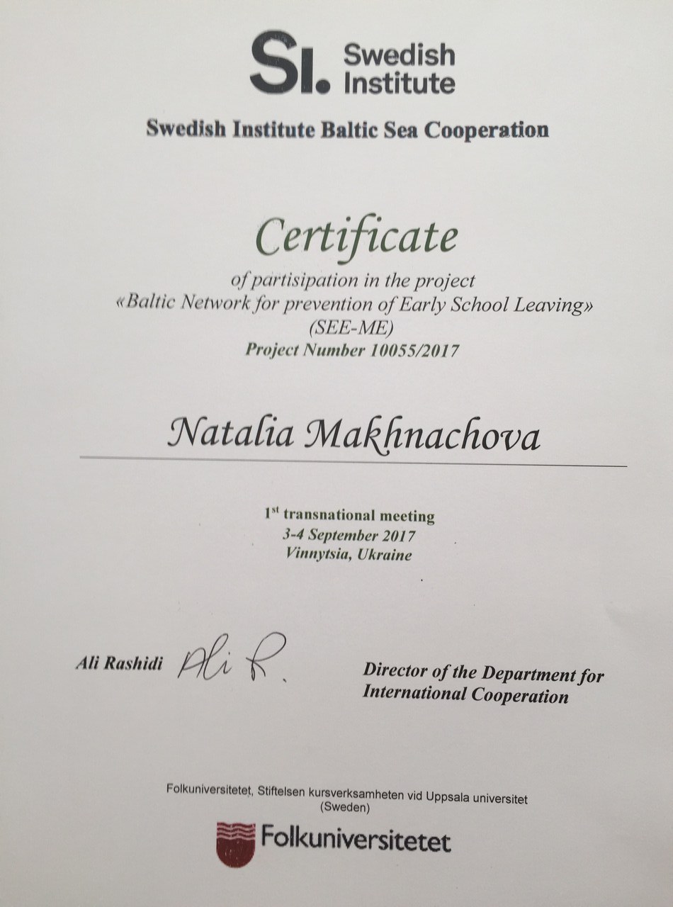 3-4 вересня 2017 року доцент кафедри менеджменту та адміністрування, координатор ресурсного центру Махначова Н.М. та асистент кафедри менеджменту та адміністрування Семенюк І.Ю. прийняли участь у зустрічі-презентації міжнародного проекту "Baltic Network for prevention of Early School Leaving" (SEE-ME), що фінансується грантом Швецького інституту. Протягом двох днів було сплановано роботу, так як проект триває 1,5 року, ділилися досвідом, обговорювали проблематику інклюзивної освіти в різних країнах з Алі Рашиді, директором департаменту міжнародного співробітництва Folkuniversitetet, Швеція, партнерами з Вінницького національного медичного університету, Вінницького національного аграрного університету, Вінницького вищого училища сфери послуг та гостями з Коледжу Михая Емінеску (Сороки, Молдова).