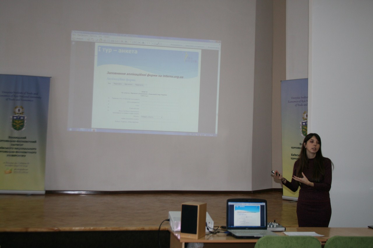 На презентації також був присутній Дмитро Мельник - випускник Вінницького торговельно-економічного інституту КНТЕУ (2012 р.), який успішно пройшов стажування в Апараті Верховної Ради України та зараз працює помічником-консультантом народного депутата України. Студенти ВТЕІ КНТЕУ мали змогу «з перших уст» почути як проходить стажування, які дає можливості та перспективи у подальшому житті.