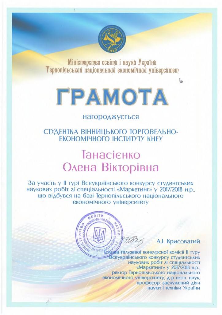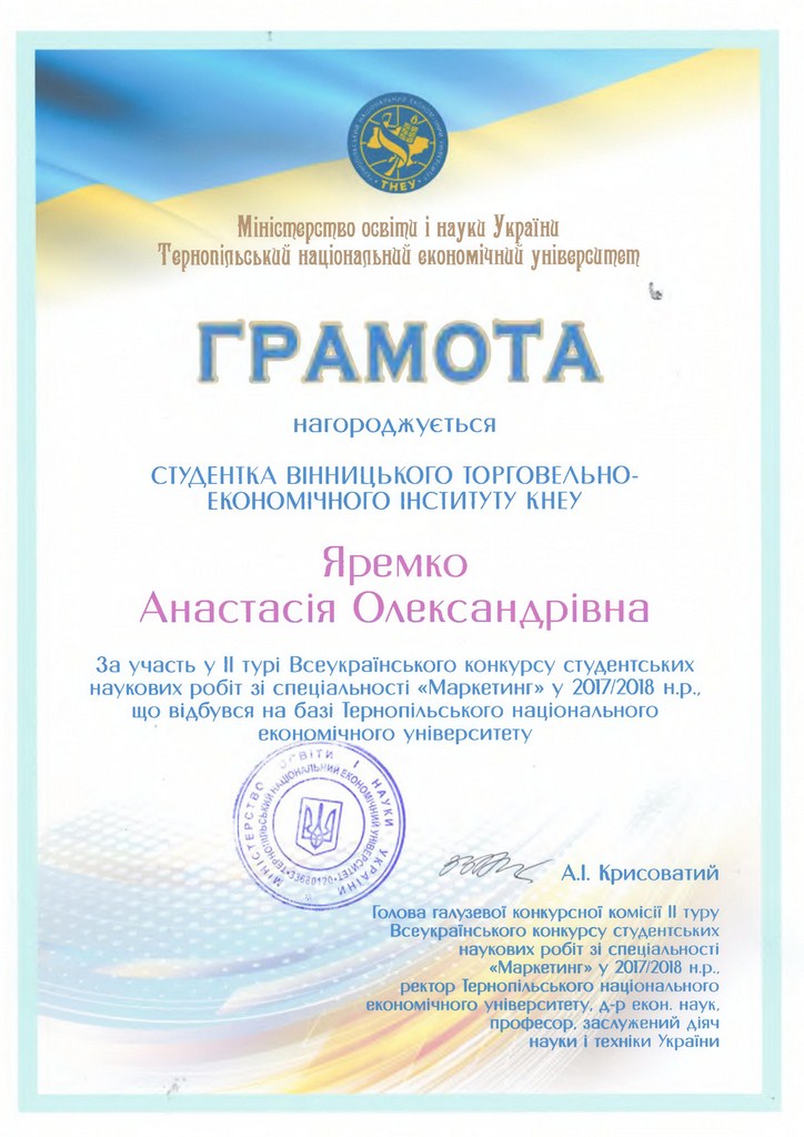 Перемога у ІІ турі Всеукраїнського конкурсу студентських наукових робіт з галузей знань і спеціальностей зі спеціальності «Маркетинг»