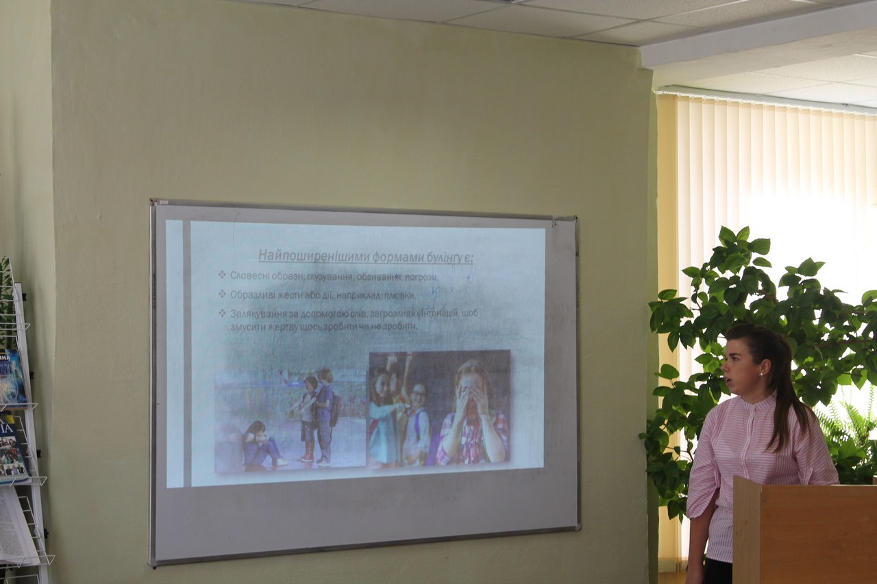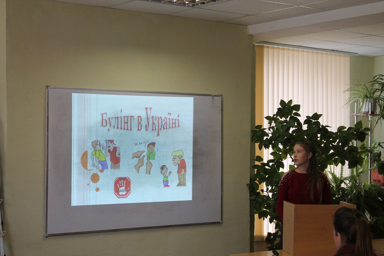 З цікавими доповідями і презентаціями виступили члени наукового гуртка: Діана Гук (група ФПР-41д) розкрила поняття «булінг» та хто найчастіше стає жертвами цькувань у закладах освіти, Анастасія Гончарук (група КПР-31д) назвала форми прояву булінгу, Даша Коваль (група ФПР-41д) надала інформацію про відповідальність за цькування та приниження дітей.