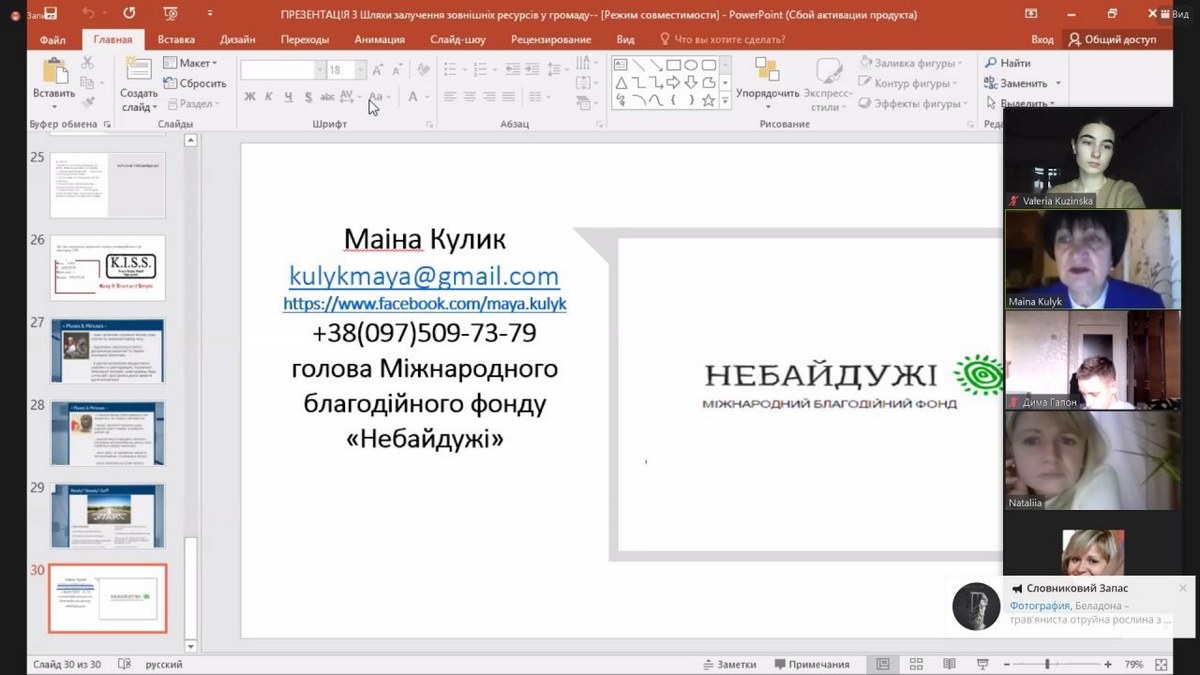 Протягом 13-30 листопада 2020 року студентка спеціальності «Публічне управління та адмініструванням» Валерія Кузінська брала участь у регіональному етапі програми особистісного та професійного розвитку молоді «Державотворець», що проводився у форматі онлайн.