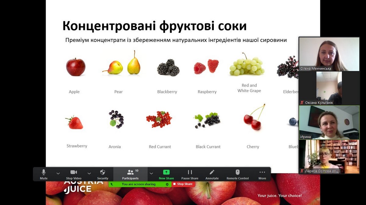 16 квітня 2021 року фінансовим консультантом ТОВ «Австрія Джус Україна» Іриною Антонюк було проведено відкриту лекцію для викладачів кафедри економіки та міжнародних відносин на тему: «Перспективи міжнародного співробітництва підприємства». Під час лекції окреслено основні проблеми, пріоритети і ключові напрямки співпраці ТОВ «Австрія Джус Україна» з іноземними партнерами, а також наголошено на проблемах, пов’язаних з подоланням наслідків пандемії COVID-19 для усієї переробної галузі промисловості.