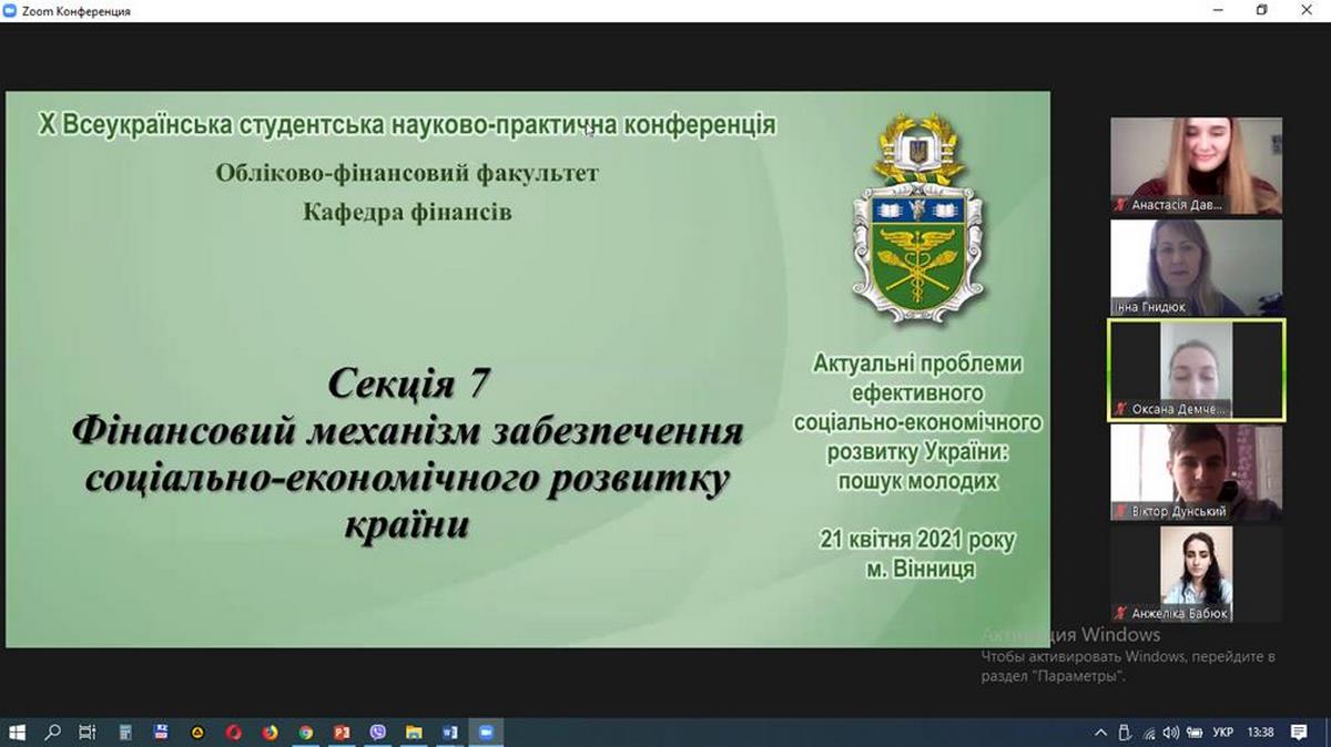 21 квітня 2021 року кафедрою фінансів організовано і проведено в режимі online на платформі Zoom секційне засідання «Фінансовий механізм забезпечення соціально-економічного розвитку країни» Х Всеукраїнської студентської науково-практичної конференції «Актуальні проблеми ефективного соціально-економічного розвитку України: пошук молодих». Засідання секції відкрила керівник секції к.е.н., доцент Оксана Демченко, з вітальним словом виступила завідувачка кафедри фінансів к.е.н., доцент Інна Гнидюк.