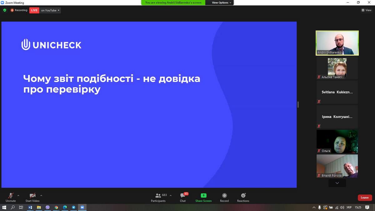Щиро дякуємо команді Unicheck та Academic IQ за організацію заходу, особисто Андрію Сідляренко за обмін досвідом, за практичні поради щодо аналізу звіту про перевірку на плагіат.