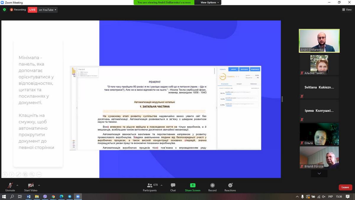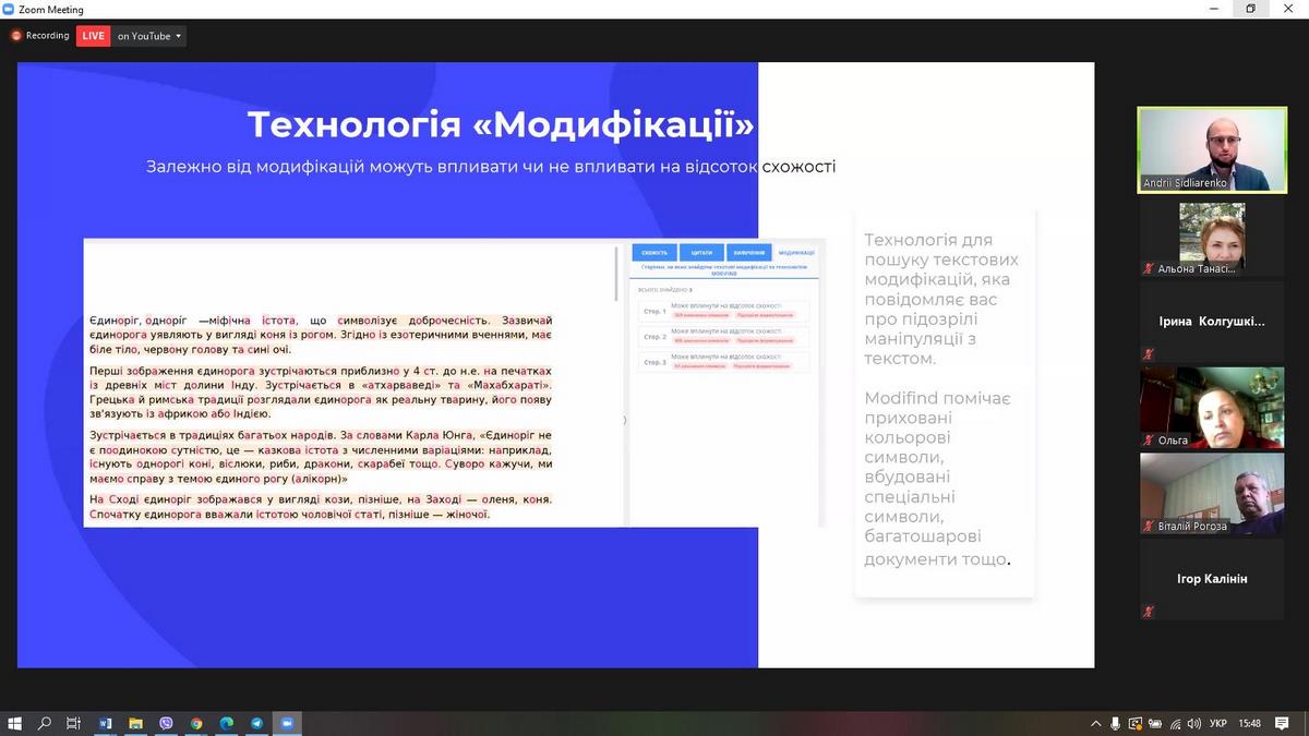 Андрій Сідляренко розповів як синергія людини та машини дає найкращі результати перевірки на плагіат. На практичних прикладах пояснив, чому звіт подібності - не довідка про перевірку та на які сигнали звіту подібності потрібно звертати увагу, які технології використовують для пошуку текстових модифікацій.
