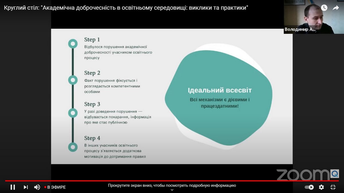 Учасники круглого столу ознайомилися з практичними кейсами розроблення та впровадження університетських політик академічної доброчесності в Україні, дізналися як налагоджується процес комунікації зі студентами та викладачами, які необхідні ресурси для забезпечення академічної доброчесності використовуються різними закладами вищої освіти, як здійснюється моніторинг за дотриманням академічної доброчесності.