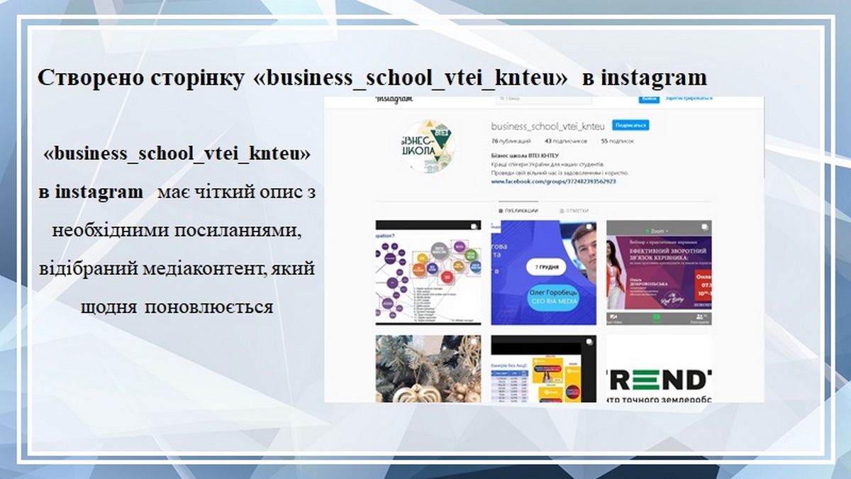 Майже 500 здобувачів вищої освіти Вінницького торговельно-економічного інституту КНТЕУ відвідували заходи, а 40 з них успішно виконали програму та отримали сертифікат Бізнес-школи ВТЕІ КНТЕУ. Сертифікат підтверджує рівень професійної підготовки його власника, і в близькій перспективі виконуватиме рекомендаційну функцію при працевлаштуванні.