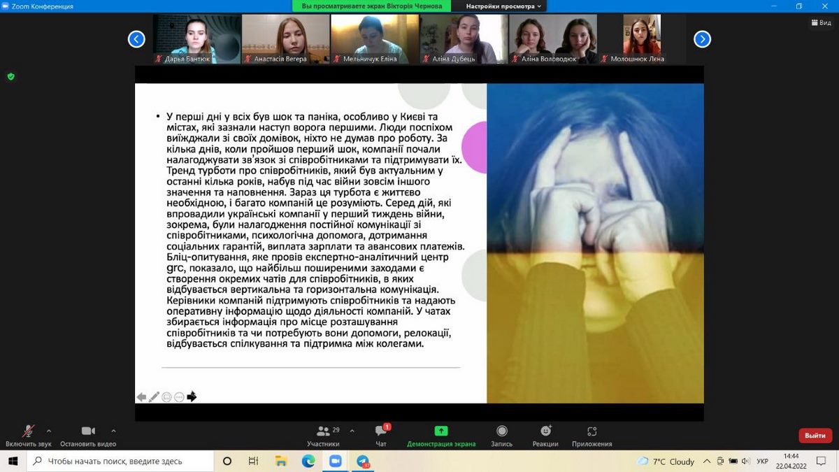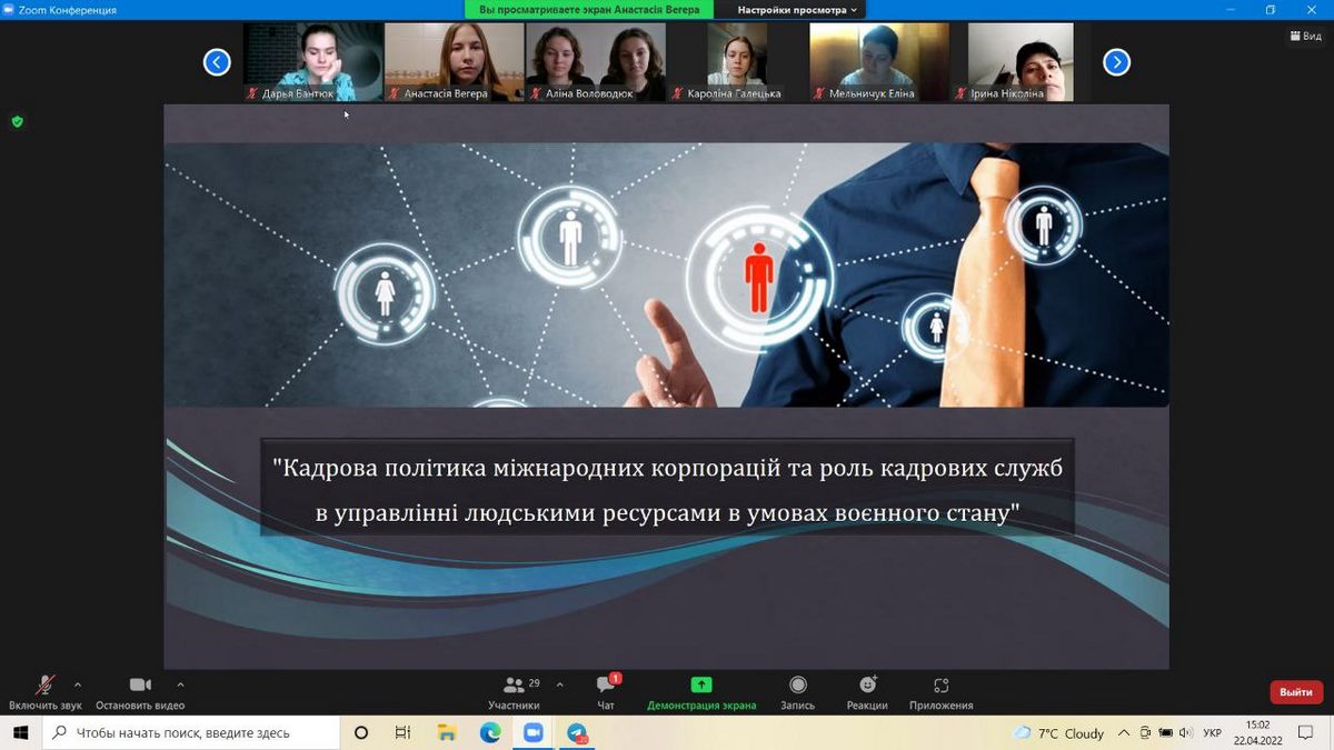 22 квітня 2022 року було проведено відкрите засідання дискусійного клубу "Менеджмент та публічне управління: інновації та глобальні тренди в умовах євроінтеграції" на тему "Управління персоналом у міжнародних корпораціях в сучасних умовах (воєнний стан)". Керівник – Едуард Ковтун. На засіданні були присутні здобувачі вищої освіти груп МЗД-31д, ПУА-31,32д та науково-педагогічні працівники кафедри менеджменту та адміністрування. З презентаціями на актуальні теми виступили наступні здобувачі вищої освіти: "Система управління персоналом у міжнародних корпораціях та їх структурних підрозділах в умовах воєнного стану" - Чернова Вікторія. "Кадрова політика міжнародних корпорацій та роль кадрових служб в управлінні людськими ресурсами в умовах воєнного стану" - Вегера Анастасія. "Особливості менеджменту персоналу в міжнародних корпораціях в умовах воєнного стану" - Бантюк Дарина. Члени дискусійного клубу прийняли жваву участь у дискусії, де кожний учасник засідання отримав відповіді на питання, які його зацікавили.
