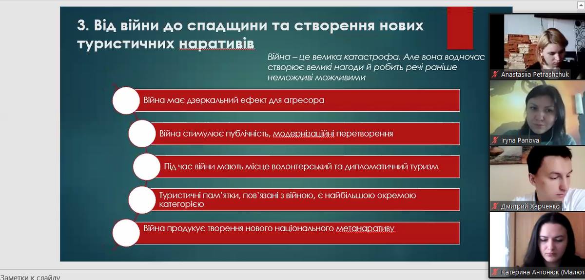 На круглому столі зазнала обговорення проблема впливу війни росії проти України на функціонування туристичної галузі в Україні та світі, а також низка дотичних питань, зокрема, чим наразі займаються підприємства туристичної індустрії України? які дестинації та види туризму стануть актуальними після війни? чи зросте інтерес в іноземних туристів до відпочинку в Україні? тощо.