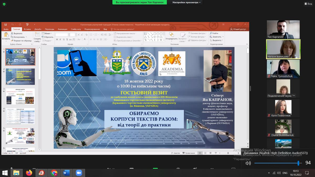 18 жовтня доктор філологічних наук, доцент Ян Капранов (Київський національний лінгвістичний університет, Варшавський економіко-гуманітарний університет) на запрошення кафедри іноземної філології та перекладу провів гостьову лекцію-тренінг для студентів спеціальності Філологія.