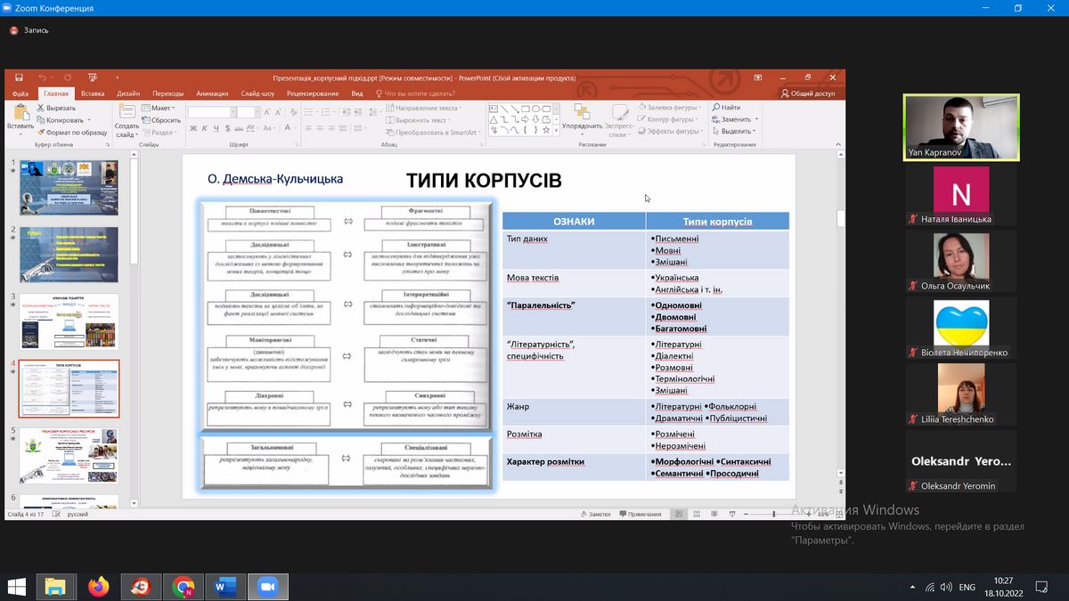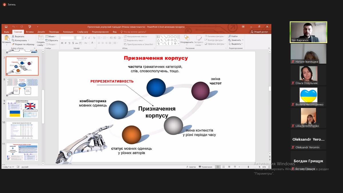 Спікер поділився кращими практиками створення та використання сучасних корпусів текстів, проілюстрував функціонал British National Corpus (BNC) та Генерального регіонально анотованого корпусу української мови (ГРАК), відповів на запитання студентів та викладачів.