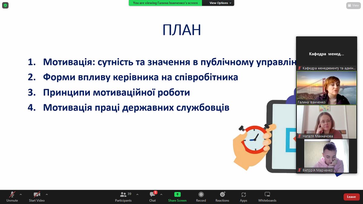 В ході лекції Галина Іванченко презентувала теоретичні аспекти мотивування персоналу в органах публічної влади, в свою чергу, Костянтин Герасимюк ознайомив студентів з правовим механізмом та практичними кейсами мотивації державних службовців Міжрегіонального управління Національного агентства України з питань державної служби у Вінницькій, Житомирській та Хмельницькій областях. Під час лекції здобувачі вищої освіти отримали вичерпні відповіді на свої питання щодо практичного досвіду розбудови системи мотивації в публічній організації.