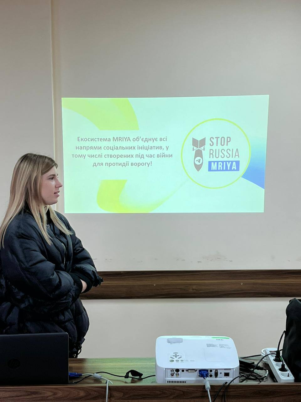 Під час лекції Марина зазначила, що з початку війни Україна стала ціллю чисельних кібератак, які охопили державні установи, приватні організації та громадян. Розповіла про види кіберзлочнів, які вчиняються в умовах воєнного стану, надала рекомендації, як не стати жертвою кіберзлочину. Також ознайомила студентів та запросила приєднатися до участі у проєкті Мрія, який створила Кіберполіція, що об’єднує небайдужих громадян у напрямку протидії дезінформації, а також російській пропаганді у мережі Інтернет.