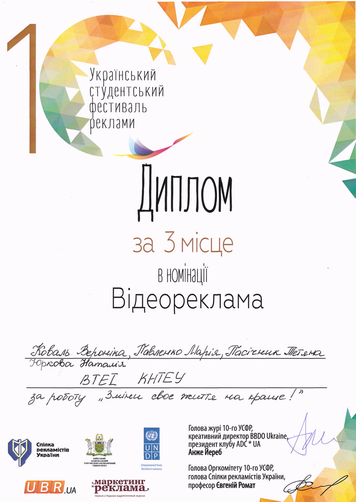 нагородження учасників фестивалю Євген Вікторович Ромат відзначив: «Переможці цьогорічного фестивалю – справжні професіонали, які вже зараз можуть претендувати на робочі місця у провідних рекламних агентствах». Команда ВТЕІ КНТЕУ отримала три нагороди: Диплом за 2 місце у номінації «Змінимо життя на краще! Будуємо нову країну разом» Підтема: «Що хвилює молодь сьогодні?» - Каневський Д., Красноштан В., Лукиянчтн В. гр.МР-11с робота: «Ролік на підтримку військових». Диплом за 3 місце у номінації «Змінимо життя на краще! Будуємо нову країну разом» Підтема: «Що хвилює молодь сьогодні?» - Щур Роман гр.МР-11м робота: «Уделите минутку родителям». Диплом за 3 місце у номінації ВІДЕОРЕКЛАМА - Юркова Н., Коваль В., Павленко М., Пасічник Т. гр.МР31 робота «Зміни своє життя на краще!».
