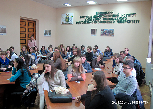 9 грудня 2014 року в аудиторії №17 першого корпусу ВТЕІ КНТЕУ в рамках «Всеукраїнського тижня права» для груп студентів першого курсу була проведена зустріч з Вірою Онисимівною Драчинською – начальником відділу реєстрації, систематизації нормативно-правових актів, правоосвітньої роботи та правової допомоги Головного управляння юстиції у Вінницькій області. Тема лекції: «Права людини: зміст, реалізація і захист». Лектор, як досвідчений фахівець, з багаторічним досвідом роботи, розповідала присутнім про основні напрямки роботи управляння юстиції, про порядок надання безоплатної правової допомоги, особливо стосовно захисту прав основних свобод людини, про порядок реєстрації і ліквідації суб’єктів підприємницької діяльності та громадських організацій.