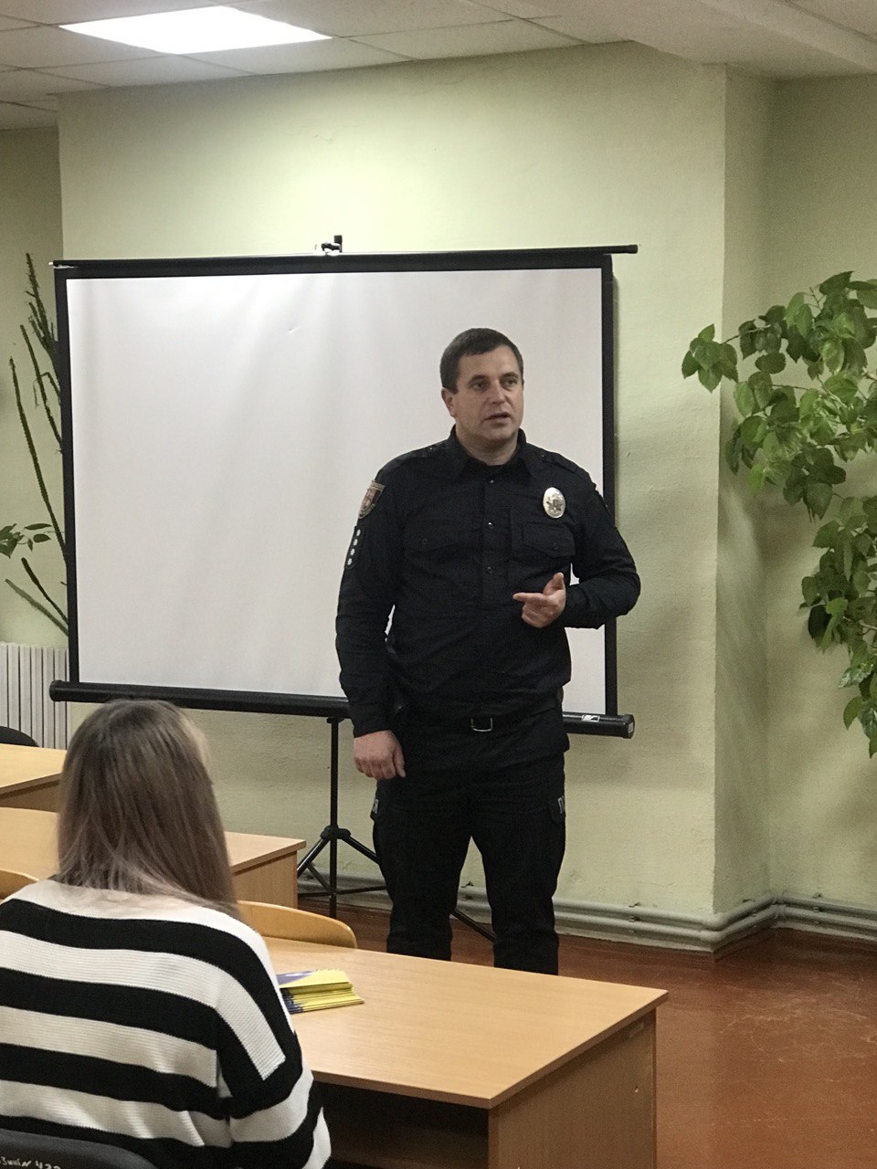 Валерій Кравчук – начальник сектору протидії домашнього насильства, розповів студентам спеціальності «Право» про роботу працівників поліції у боротьбі з домашнім насильством, про відповідальність кривдників за домашнє насильство, а також про інтерактивну виставку «Річ у тім», відсканувавши QR-коди на світлинах, представлених на виставці, можна побачити відеоролики, в яких відомі публічні особи розповідають про випадки домашнього насильства із застосуванням побутових речей.