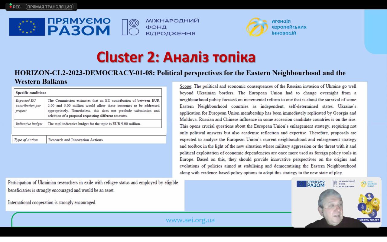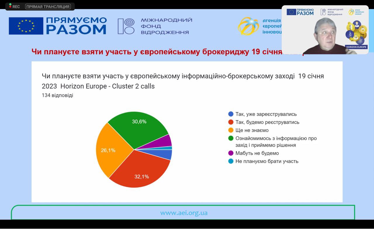 На вебінарі було представлено цінну та користну інформацію щодо загальних правил участі у конкурсах програми Горизонт Європа, пошуку партнерів для спільних проєктів, підготовки і поширення профілів та участі у заходах ЄК.
