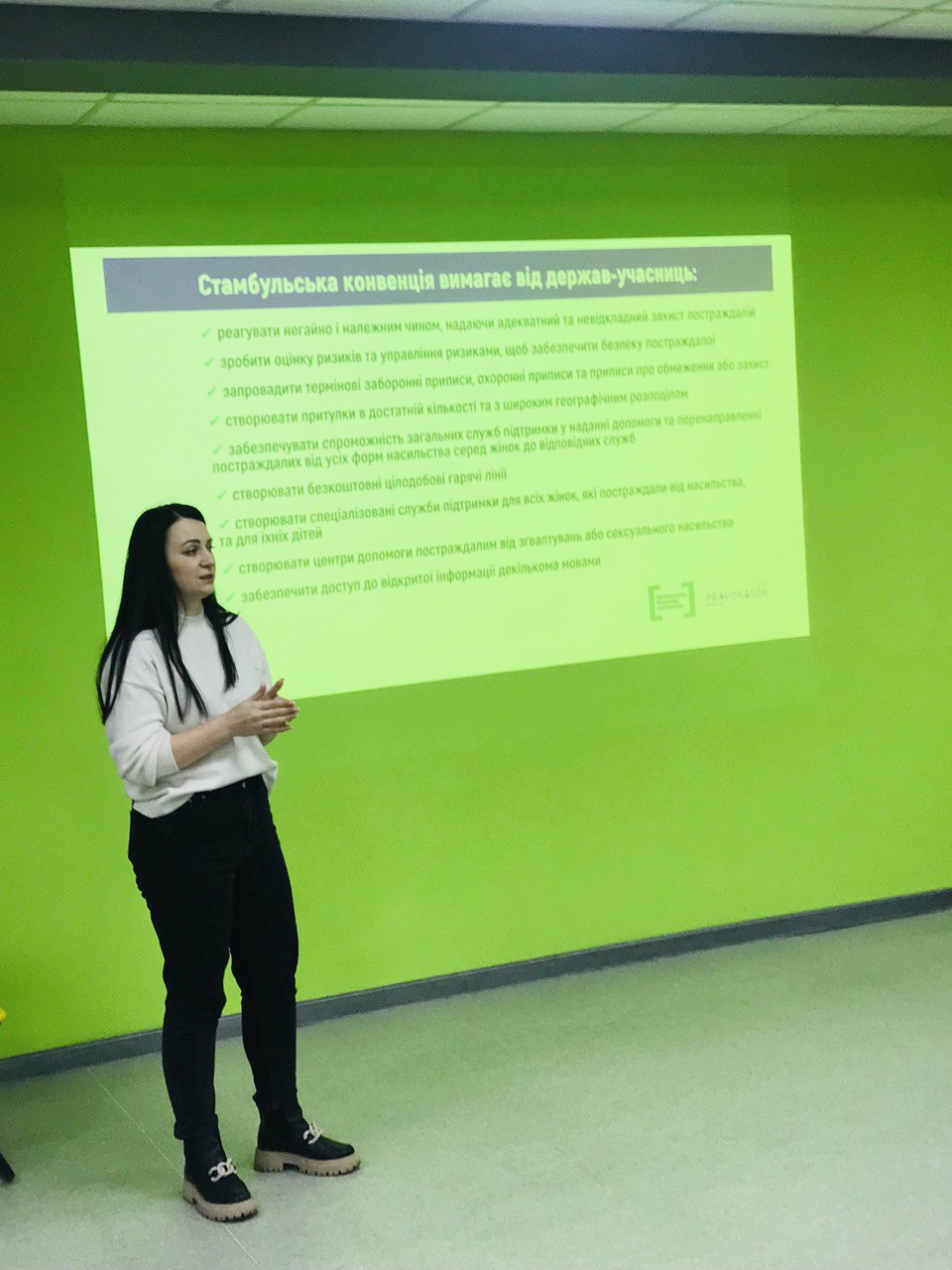Акцентувала увагу на те, що в Україні в умовах війни 01 листопада 2022 року набула чинності Конвенція Ради Європи «Про запобігання насильству стосовно жінок і домашньому насильству та боротьбу з цими явищами» (Стамбульська конвенція), яка спрямована на захист, запобігання та протидію насильству стосовно жінок та домашньому насильству. Під час воєнного стану в Україні Стамбульська конвенція захищає українців у тих країнах, куди вони вимушені були переїхати через бойові дії і де її ратифіковано, тобто Конвенція визначає юрисдикцію України над правопорушеннями, встановленими нею, там, де раніше така юрисдикція не здійснювалась. Пані Наталія розкрила цілі, зміст норм Стамбульської конвенції, її вплив на формування кримінально-правової політики щодо охорони сексуальних відносин. Разом із учасниками тренінгу розвінчували міфи та маніпуляції, які обговорюють в інформаційному просторі щодо реалізації Стамбульської конвенції в Україні.