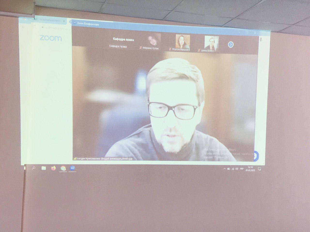 1 березня 2023 року відбулося відкрите засідання наукового гуртка «Феміда» (керівник кандидат юридичних наук, доцент кафедри права Білоус Ірина) на тему «Антикорупційні органи в Україні: розподіл обов’язків та повноважень». Члени гуртка обговорили питання про місце і роль антикорупційних органів в Україні, розподіл їх обов’язків та повноважень. Також в режимі он-лайн на засіданні гуртка був присутній Богдан Крикливенко – керівник апарату Вищого антикорупційного суду (ВАКС), який розповів про місію ВАКС, яка полягає в здійсненні справедливого правосуддя в кримінальних провадженнях щодо корупційних злочинів, про повноваження суду, про те, як відбувається конкурс на посади суддів, про статистику розгляду справ ВАКС. Наприкінці зустрічі Богдан Крикливенко відповів на запитання студентів.
