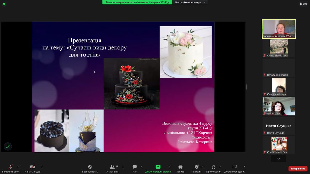 - Ігнатьєва Катерина (гр. ХТ-41д) «Торти з пелюстками живих квітів, рваним папером, скляними грушами, золотим кондуріном, харчовим золотом» – доповідь на тему;
