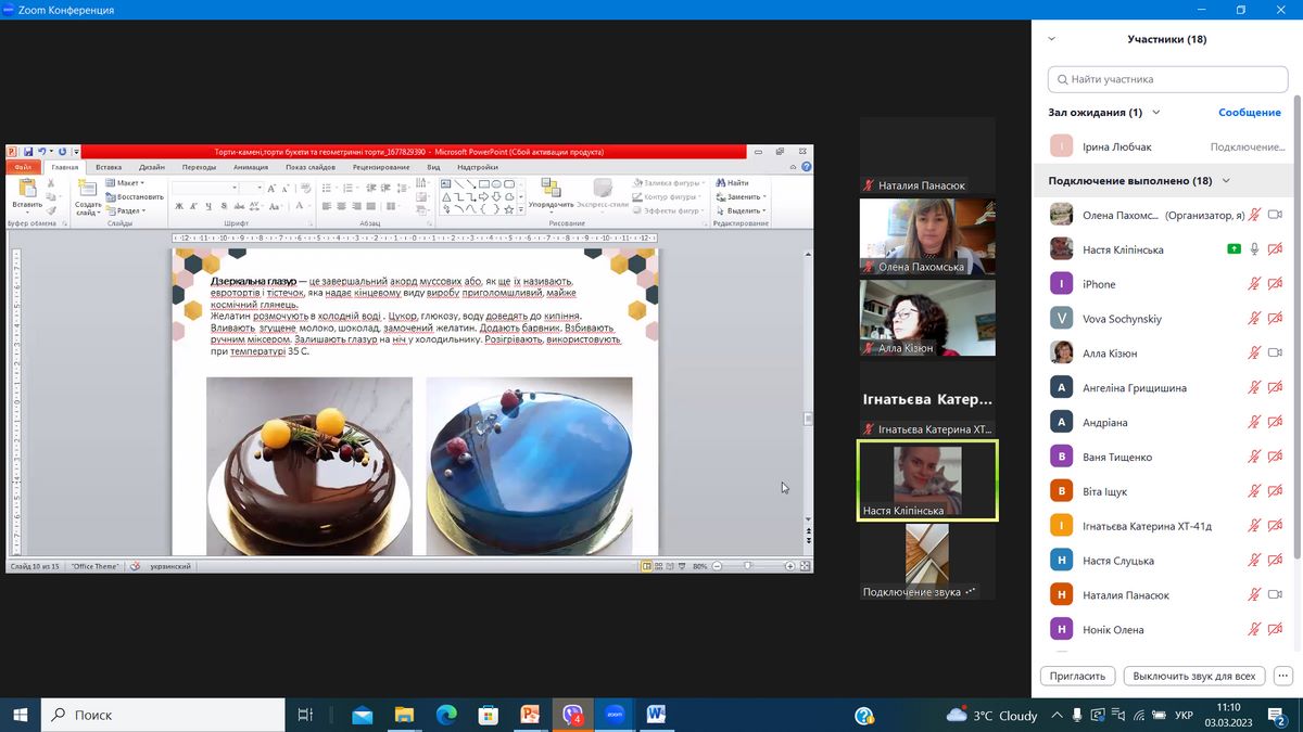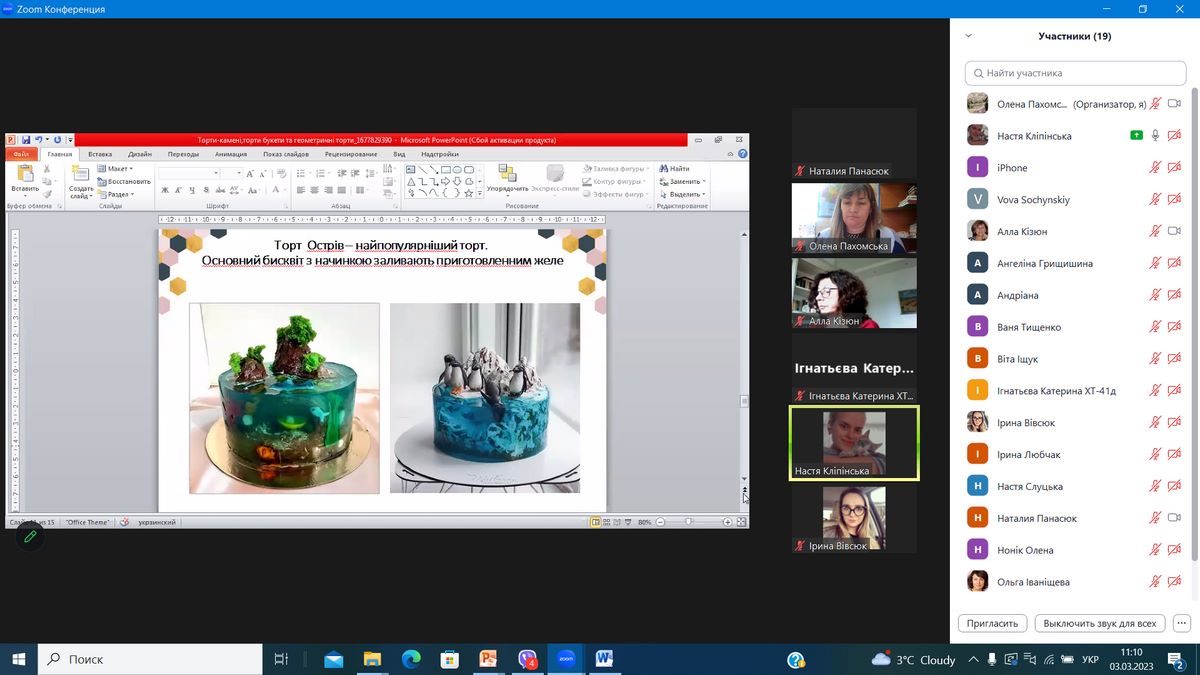 - Кліпінська Анастасія (гр. ХТ-31д) – доповідь на тему «Торти-камені, торти букети та геометричні торти»;