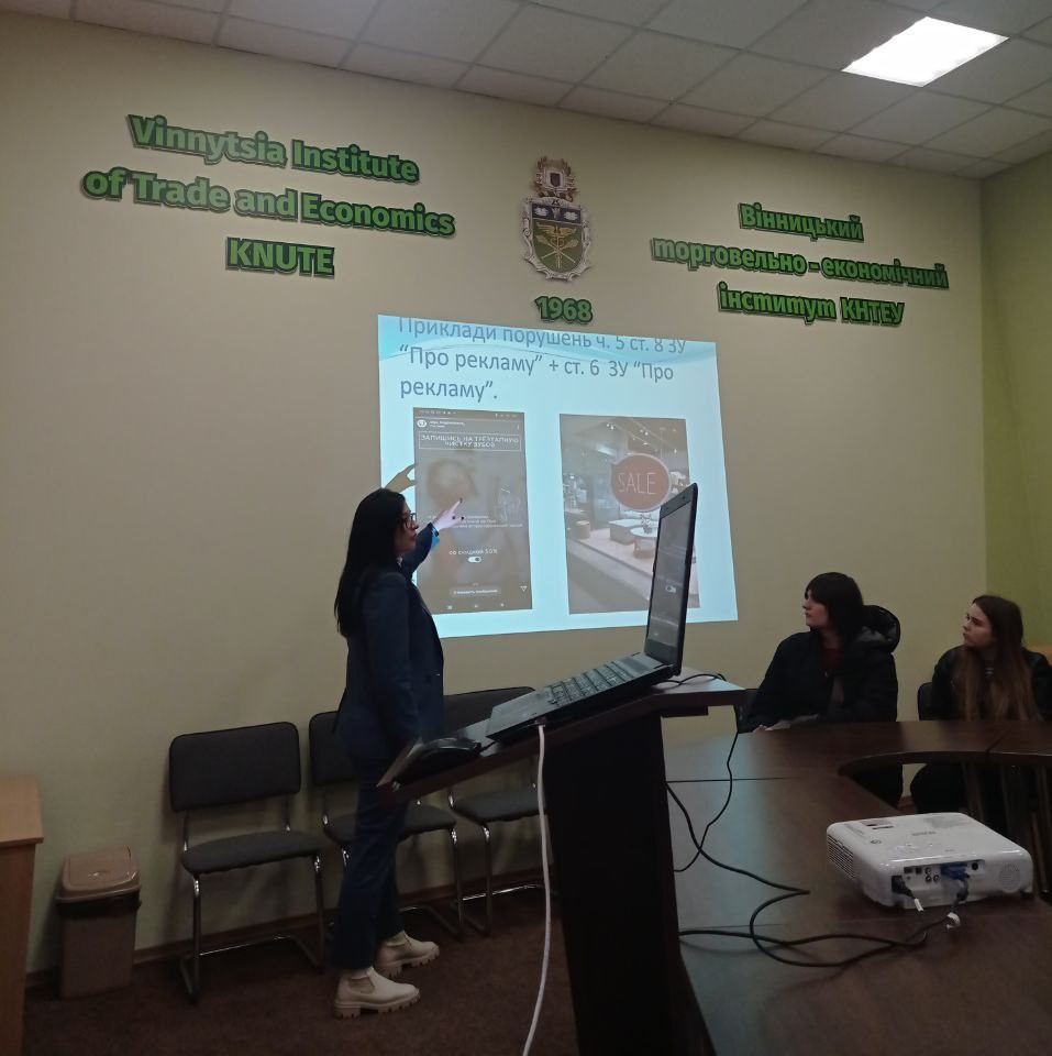 Гостя Бізнес-школи ВТЕІ ДТЕУ розповіла слухачам засідання про те, що управління захисту прав споживачів є структурним підрозділом Головного управління Держпродспоживслужби у Вінницькій області головною метою діяльності якого є реалізація державної політики у галузі державного нагляду за дотриманням законодавства «Про захист прав споживачів», «Про рекламу», «Про забезпечення функціонування української мови як державної» тощо.