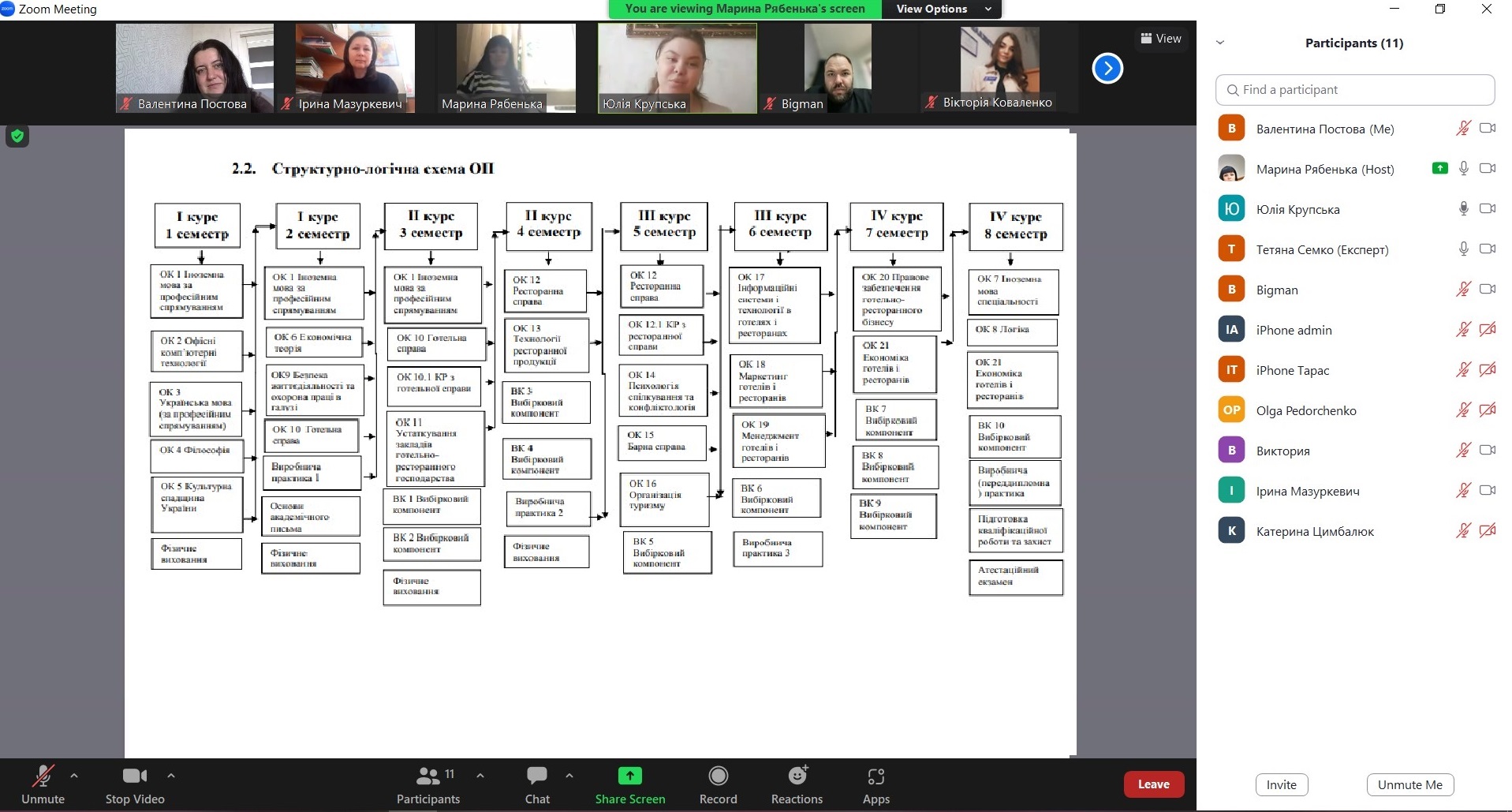 21 квітня 2023 року відбулося засідання робочої групи з розроблення освітньо-професійних програм «Готельно-ресторанна справа» ОС «бакалавр» та «магістр». У засіданні брали участь науково-педагогічні працівники кафедри туризму та готельно-ресторанної справи, директори закладів готельного та ресторанного господарства, випускники освітніх програм та здобувачі вищої освіти, які здобувають освіту за освітнім ступенем «бакалавр», «магістр».