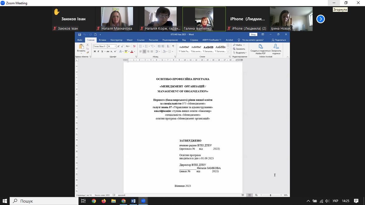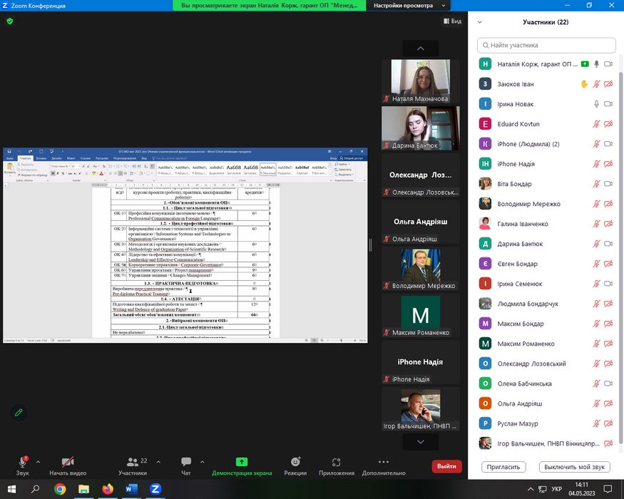 4 травня 2023 року відбулось підсумкове засідання робочих груп з розроблення освітніх програм (ОП) «Менеджмент» (молодший бакалавр), «Менеджмент організацій» (бакалавр, магістр), «Менеджмент зовнішньоекономічної діяльності» (бакалавр), за участі керівників сучасних підприємств Вінниччини, науково-педагогічних працівників кафедри менеджменту та адміністрування, студентів та випускників галузі знань 07 «Управління та адміністрування».
