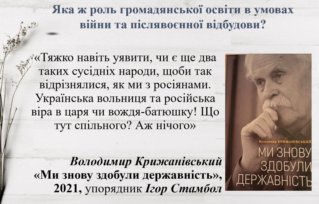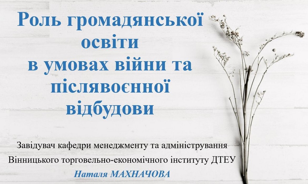 Наталя Махначова, кандидат економічних наук, доцент, завідувач кафедри менеджменту та адміністрування Вінницького торговельно-економічного інституту ДТЕУ – «Роль громадянської освіти в умовах війни та післявоєнної відбудови».