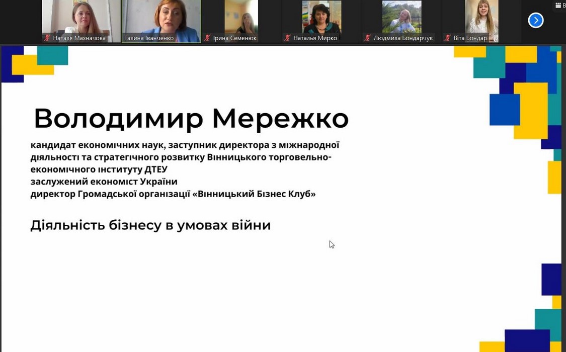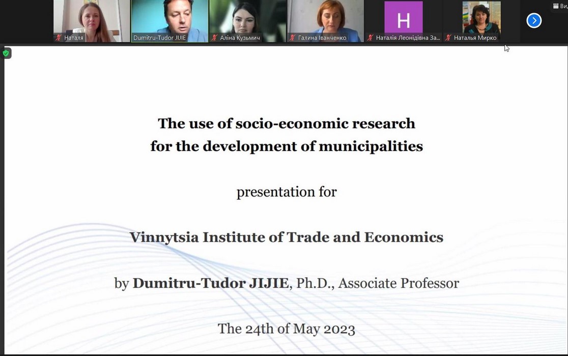 Tudor JIJIE, Associate Professor, Alexandru loan Cuza University, Romania, Iasi – «The use of socio-economic research for the development of municipalities». Володимир Мережко, кандидат економічних наук, заступник директора з міжнародної діяльності та стратегічного розвитку Вінницького торговельно-економічного інституту ДТЕУ, заслужений економіст України, директор Громадської організації «Вінницький Бізнес Клуб» - «Діяльність бізнесу в умовах війни».