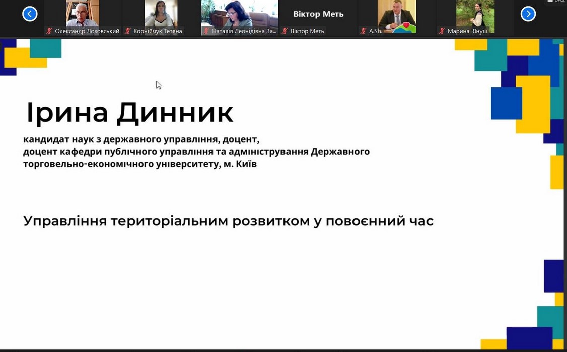 Ірина Динник, кандидат наук з державного управління, доцент, доцент кафедри публічного управління та адміністрування Державного торговельно-економічного університету (м. Київ) – «Управління територіальним розвитком у повоєнний час».