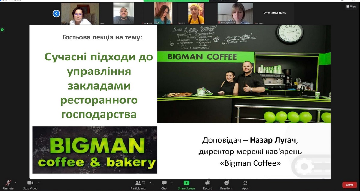 Лекцію було проведено в рамках вивчення освітньої компоненти «Управління бізнес-процесами в готельно-ресторанному бізнесі». У ході лекції розглянуто питання управління закладами ресторанного господарства в умовах сьогодення із врахуванням реалій ринку, війни та інших впливаючих чинників на управління бізнес-процесами. Велику увагу приділено актуальності сучасних підходів управління бізнес-процесами в ресторанному господарстві з метою конкурентного розвитку.