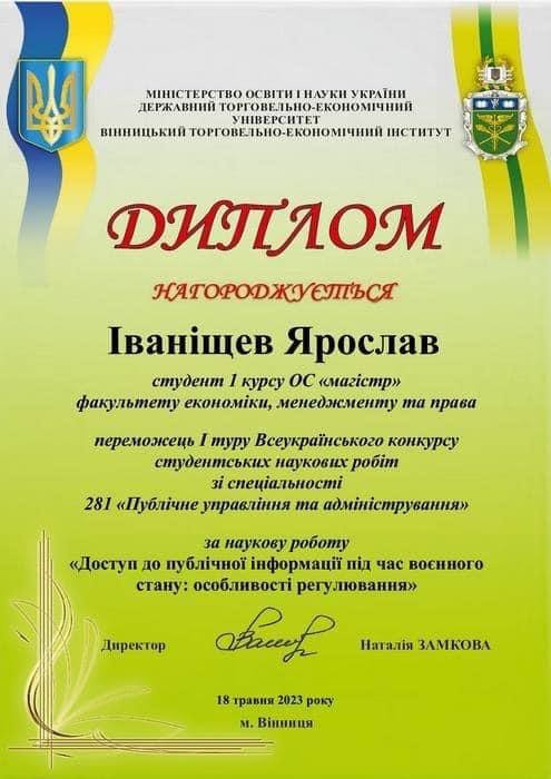 Перемога у першому турі Всеукраїнського конкурсу наукових робіт зі спеціальностей 073 «Менеджмент» та 281 «Публічне управління та адміністрування»