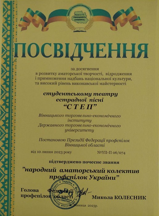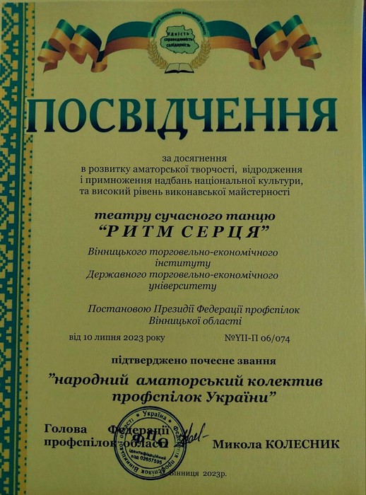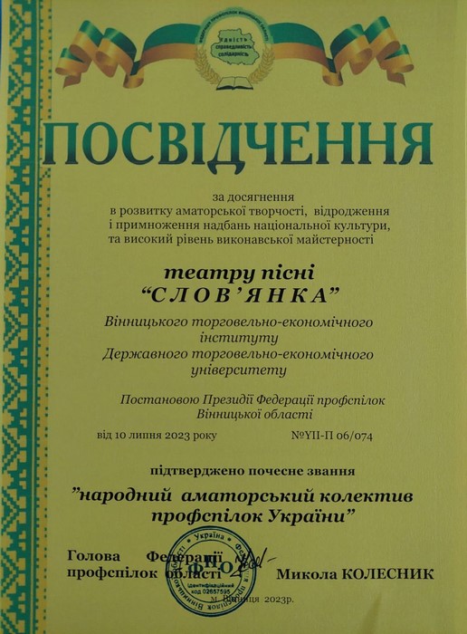 10 жовтня 2023 року на спільному засіданні Президії Профспілок області, Культурно -мистецької ради та атестаційної комісії ФПО, на який було запрошено представника Вінницького торговельно-економічного інституту ДТЕУ - начальника відділу з організації виховної та культурно-мистецької роботи студентів Вікторію Гнатюк, відбулося вручення Посвідчень Федерації профспілок області про підтвердження почесного звання "Народний аматорський колектив профспілок України".