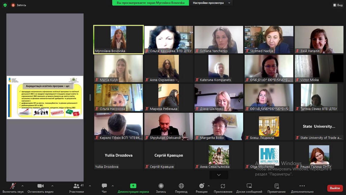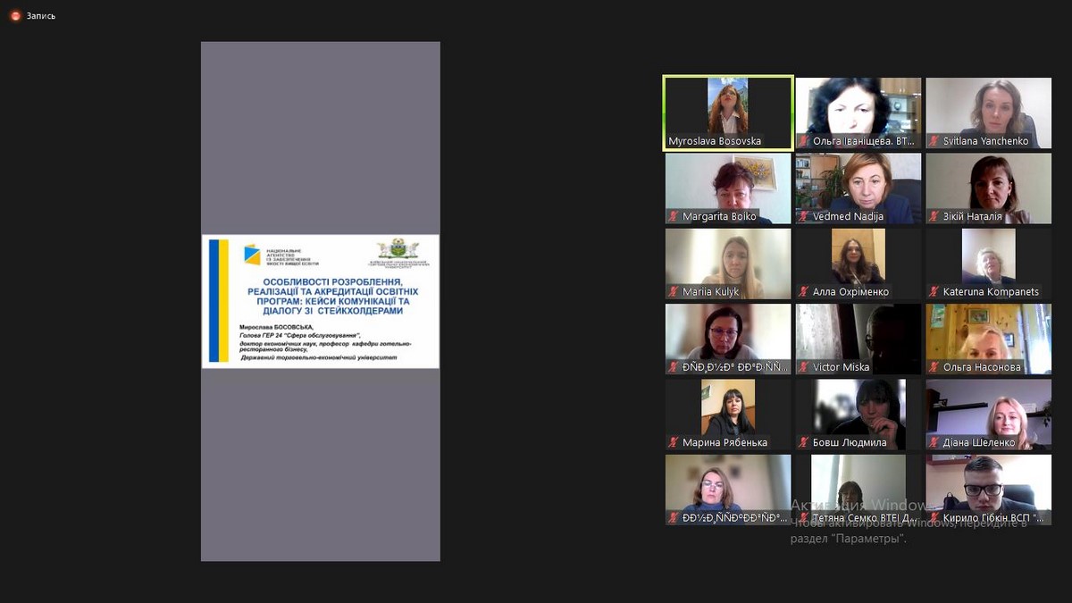 Із презентацією розвитку освітніх програм факультету виступила Надія Ведмідь, д-р екон. наук, професор, декан факультету готельно-ресторанного та туристичного бізнесу, директор ГС «Український кулінарний союз», з презентацією особливостей акредитаційної експертизи освітніх програм – Мирослава Босовська, д-р екон. наук, професор, голова галузевої експертної Ради з галузі знань 24 «Сфера обслуговування» НАЗЯВО.