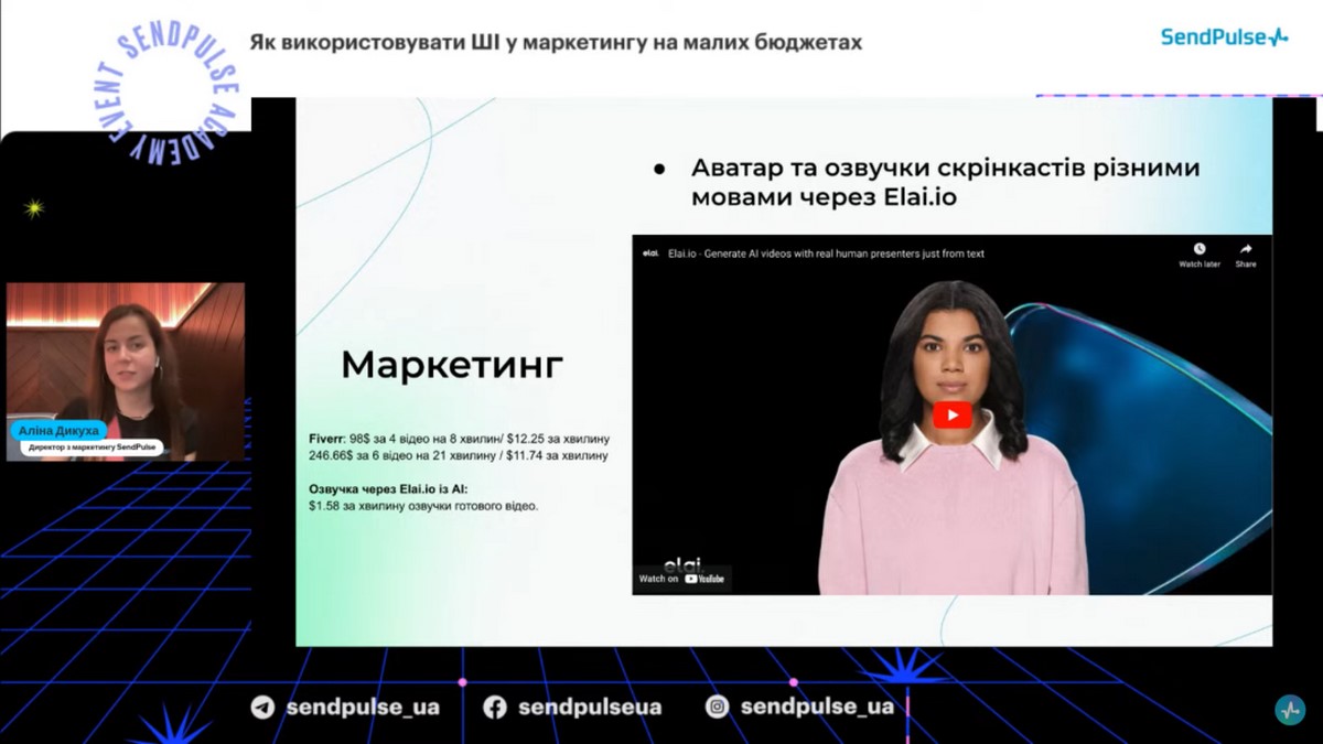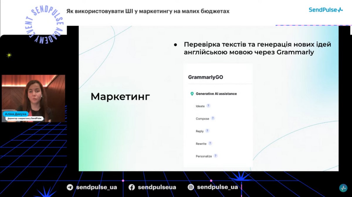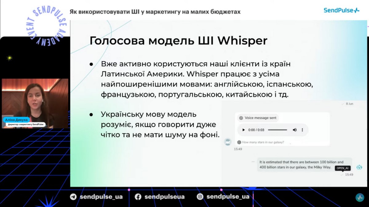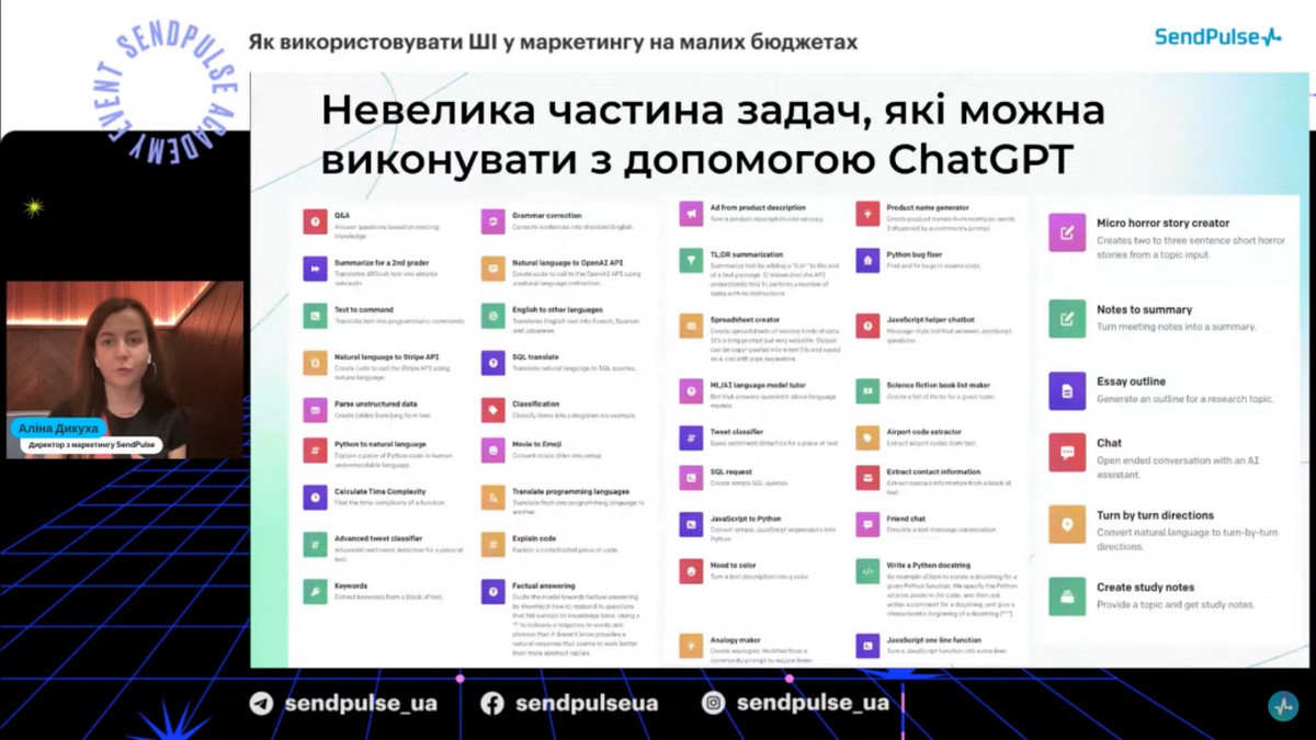 Спікерка вебінару - Аліна Дикуха, директор з маркетингу SendPulse, яка розповіла про можливості штучного інтелекту у маркетингу для малих та середніх компаній, роботу із командою розробки на рівні додавання різних моделей ШІ у сервісі SendPulse, про ШІ модель GPT-3, ШІ генерацію ланцюжків чат-бота, автоматизацію процесів, а саме як ШІ дозволяє автоматизувати рутинні задачі у маркетингу, рекомендації для підприємців та малих бізнесів: як почати використовувати ШІ в маркетингу, навіть з обмеженими бюджетами, контент для сайтів і ШІ, роботу мобільного застосунку InstaShot та ШІ.