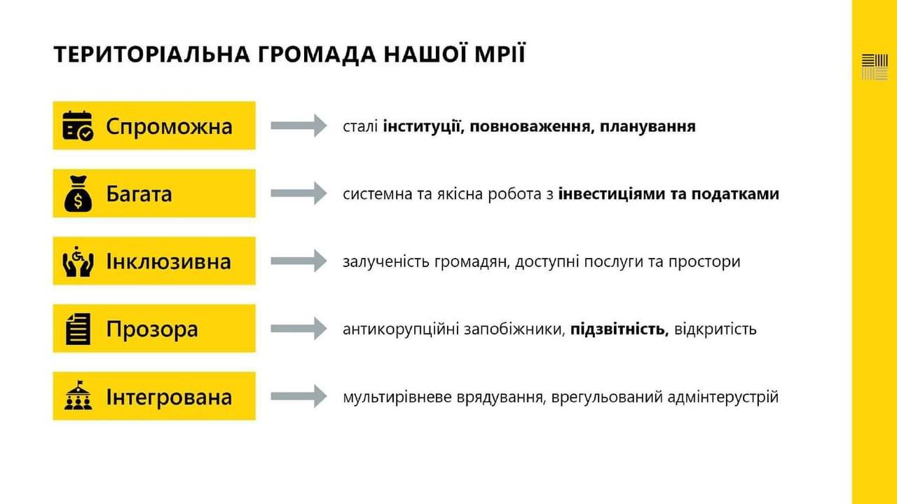 Спільна мета усіх стейкголдерів – забезпечити необхідні умови для формування спроможних, багатих, прозорих, інклюзивних та інтегрованих у систему мультирівневого урядування громад. Презентований документ має стати дороговказом реформи до 2027 року.
