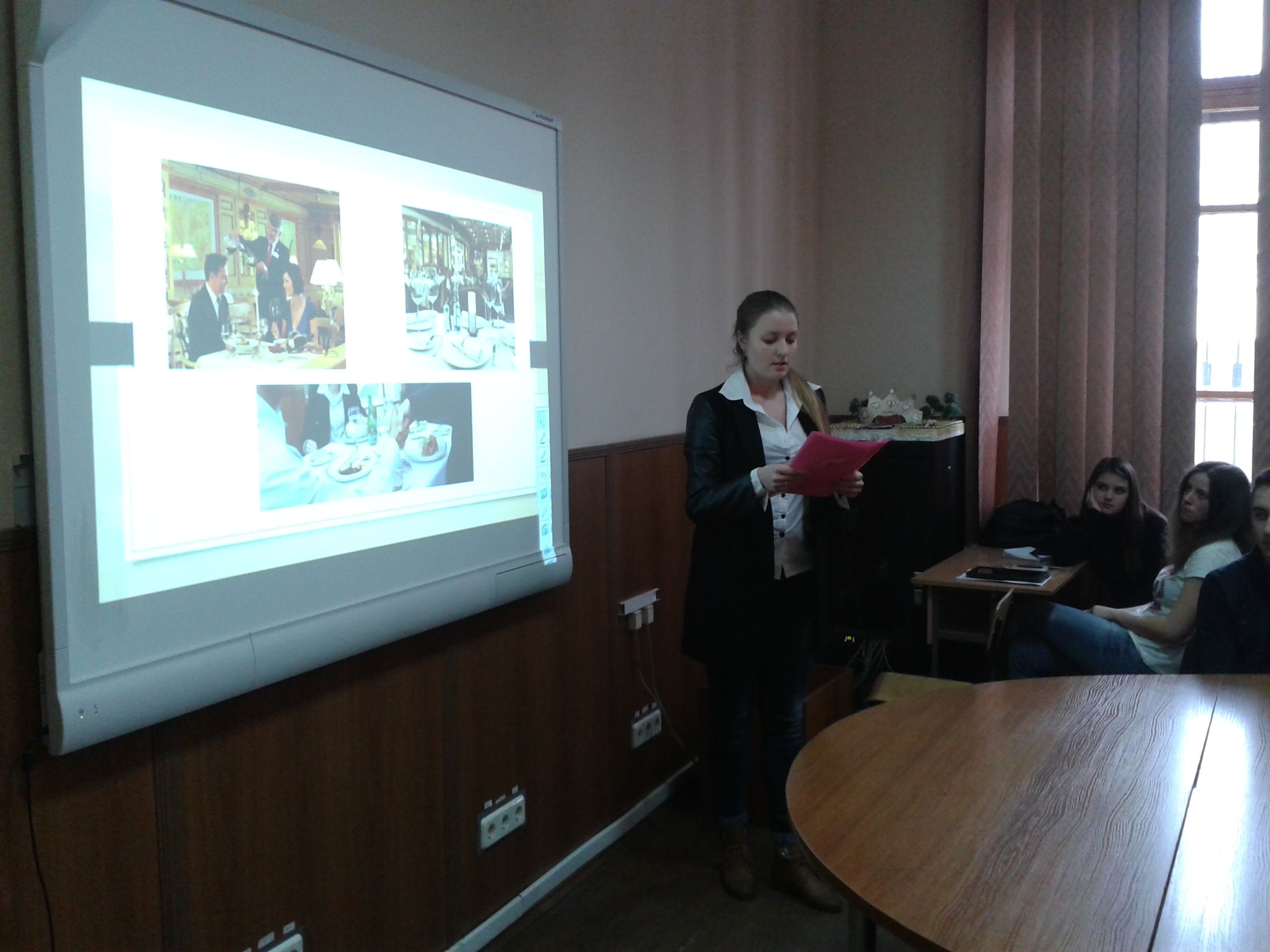 Протягом засідання гуртка студенти ознайомились з особливостями ділового етикету у міжнародному бізнесі західних та східних країн (США, Франція, Німеччина, Італія, Японія, Китай та інші). У своїх виступах студенти акцентували увагу на моральних цінностях ділової людини, різноманітних аспектах підготовки до зустрічі з іноземними партнерами, невербальних засобах комунікації. Активне обговорення викликали яскраві виступи підготовлені студентами, зокрема Окопної Ольги та Подоліної Аліни (ДФК-31) «A Guide to Good Manners or How Not to Behave Badly Abroad», спільна робота Петровської Каріни, Каракуци Марії та Гончар Аліни (ЕК-11) «Dress Code», Корсун Тетяни (Т-41) «Business Card Etiquette Tips», Гарбузової Варвари (ФП-11) «Table Manners». Цікавими для обговорення були доповіді Камінської Світлани (Т-41) «The Art of Giving Business Gifts in Different Countries» та Колісник Анни (Т-41) «Cross-cultural business language». Керівники гуртка висловили щиру подяку студентам за змістовні доповіді та висловили надію на подальшу зацікавленість у лінгвокультурних дослідженнях. У кінці зустрічі студентам було запропоновано оформити власну візитівку, з дотриманням усіх вимог, та вказати ким вони себе бачать через 10 років.