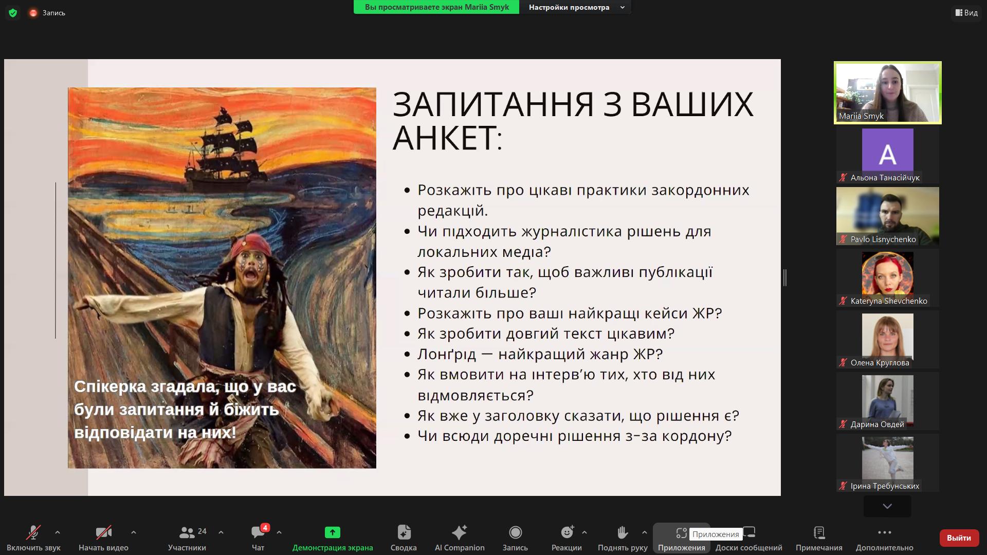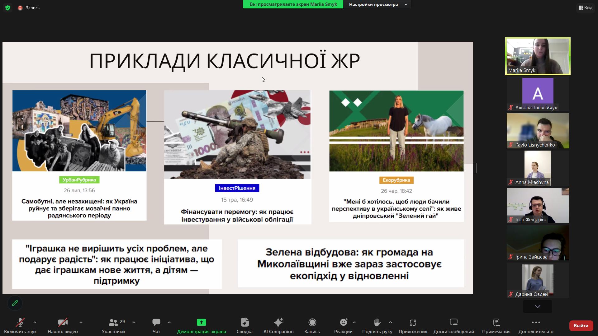 Цікавою частиною тренінгу стала робота в групах, коли всі учасники були поділені на 5 груп, розміщені в окремих онлайн кабінетах для вирішення індивідуального завдання, яке потім демонстрували всій групі. Щиро дякуємо Марії Смик за можливість брати участь у тренінгу на актуальну тему. В сучасних умовах, коли новітні медіа активно витісняють класичну журналістику рішень важливо застосовувати нові підходи ЖР щоб мати високу читабельність публікацій.