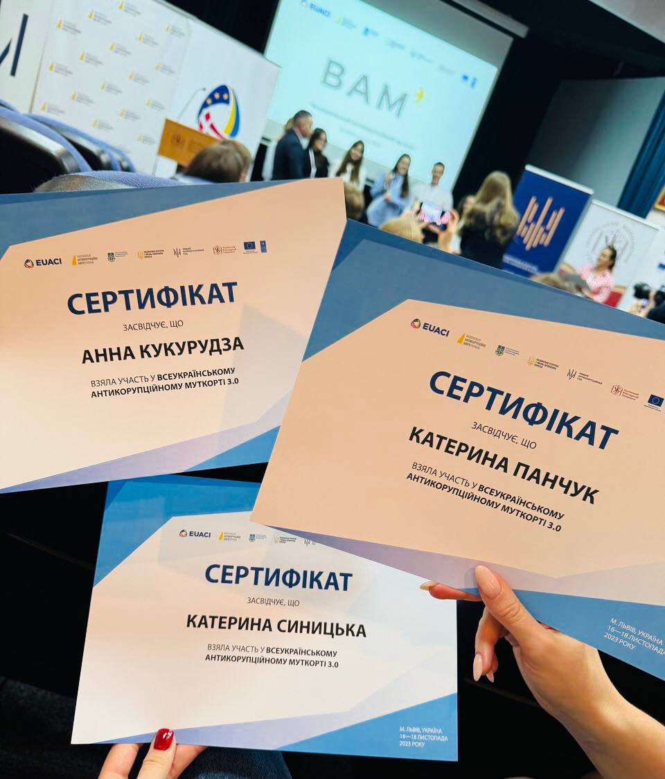 З 16-18 листопада 2023 у м. Львів команда студенток спеціальності «Право» «Extra legem» у складі – Катерина Синицька, Катерина Панчук, Анна Кукурудза брали участь у фінальних заходах Всеукраїнського антикорупційного муткорту (ВАМ 3.0.). До відкриття ВАМ 3.0 долучився Аллан Паг Крістенсен, керівник Антикорупційної ініціативи ЄС, який зауважив, що українська молодь є рушієм змін у країні та відповідальна за майбутній її розвиток.