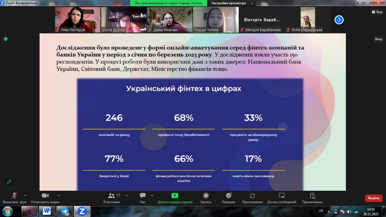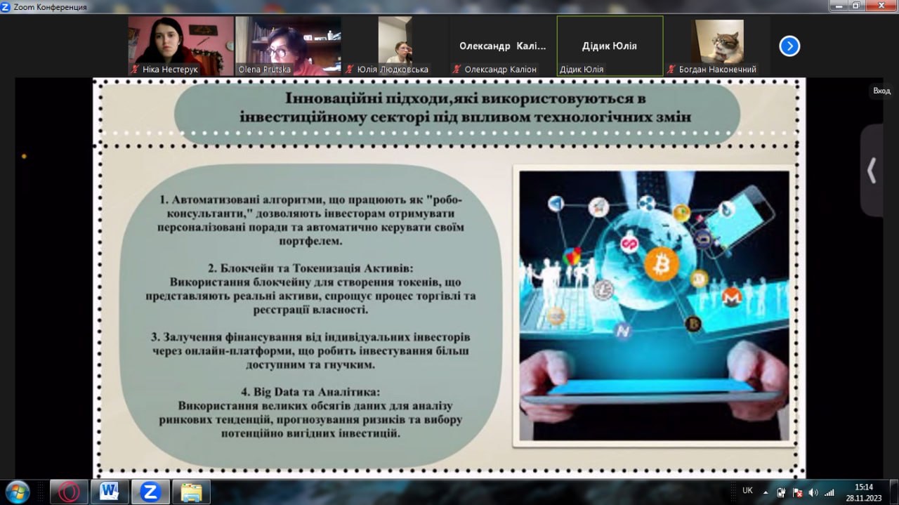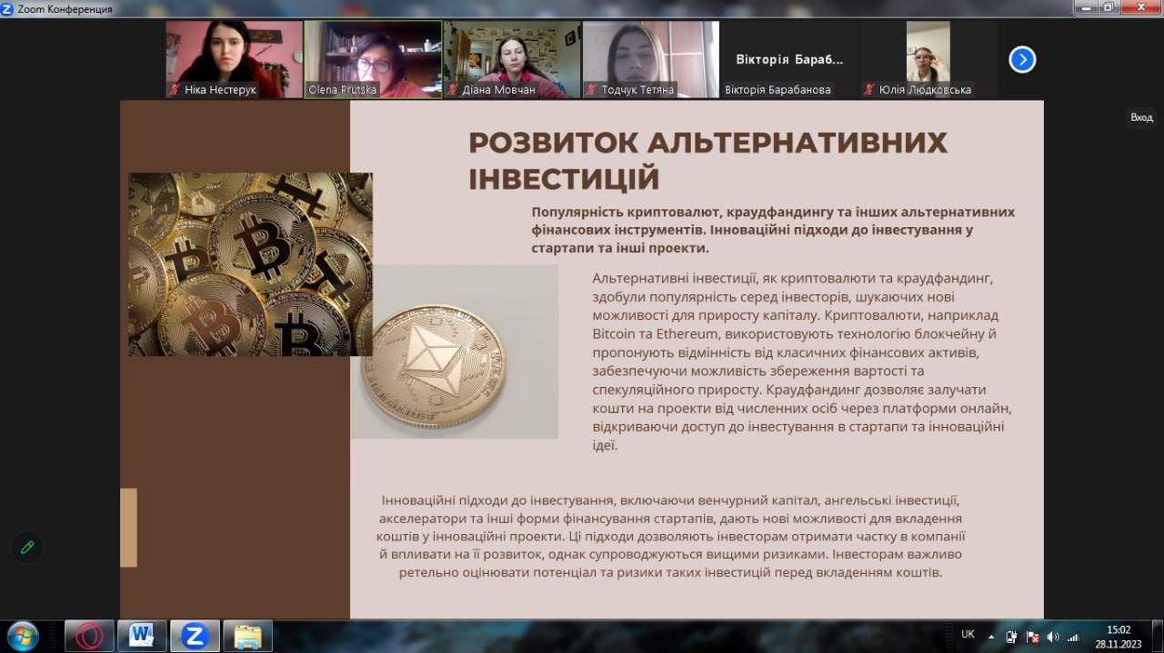 В своїх виступах і презентаціях до них студенти висвітлили особливості фінансового ринку в сучасних умовах і можливості по фінансуванню відновлення економіки України з урахуванням розвитку новітніх фінтех-технологій.