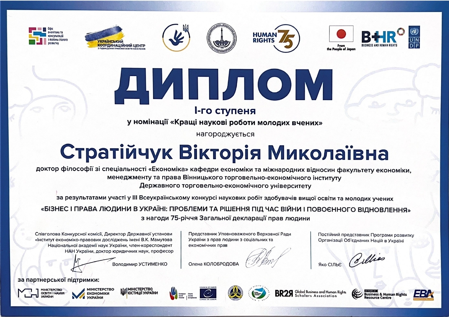Вікторія Стратійчук, доктор філософії з економіки, доцент кафедри економіки та міжнародних відносин прийняла участь у підсумковій науково-практичній конференції ІІІ-го Всеукраїнського конкурсу наукових робіт здобувачів вищої освіти та молодих учених «Бізнес і права людини в Україні: проблеми та рішення під час війни та повоєнного відновлення» з нагоди 75-річчя Загальної декларації прав людини, що була проведена у залі засідань Секретаріату Уповноваженого Верховної Ради України з прав людини (м. Київ).