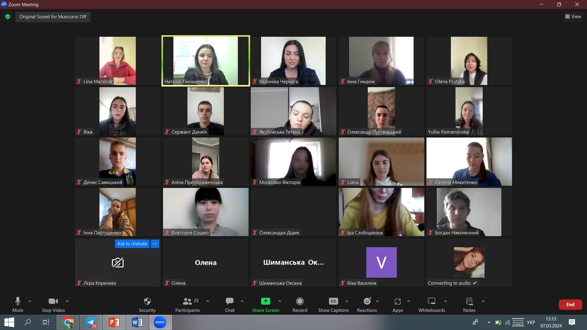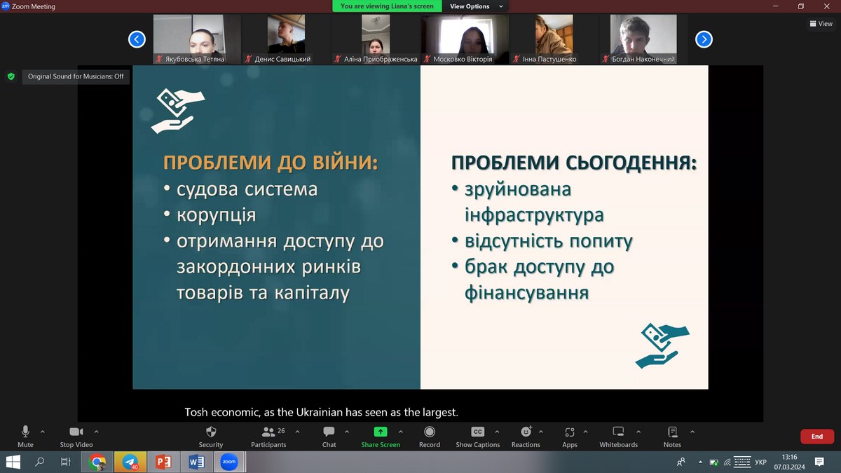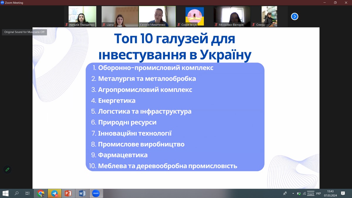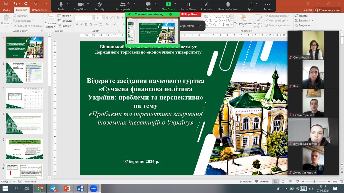 7 березня 2024 року в рамках проведення XІІ Фестивалю студентської науки, кафедрою фінансів, було проведено відкрите засідання наукового гуртка «Сучасна фінансова політика України: проблеми та перспективи» на тему «Проблеми та перспективи залучення іноземних інвестицій в Україну». Участь в науковому заході взяли здобувачі вищої освіти груп ФБСС-31д, 21д, 22д та ФБСФ-11дск. Усі доповіді учасників були грунтовними та актуальними.