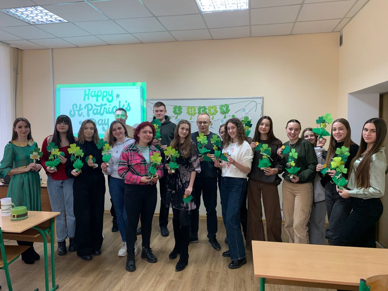 13 березня 2024 року в рамках Тижня обліково-фінансового факультету ВТЕІ ДТЕУ було проведено майстер-клас «Happy St. Patrick`s Day!». Завдяки креативному та культурологічному підходу старшої лаборантки кафедри іноземної філології та перекладу Вікторії Хейлик і здобувачки вищої освіти спеціальності 035 «Філологія» Марії Мельничук, а також студентів спеціальності 076 «Підприємництво та торгівля», учасники заходу мали змогу не лише поринути у творчу атмосферу створення головного атрибуту ірландського свята, але й дізнатися цікаві факти про звичаї та повір’я щодо його відзначення.