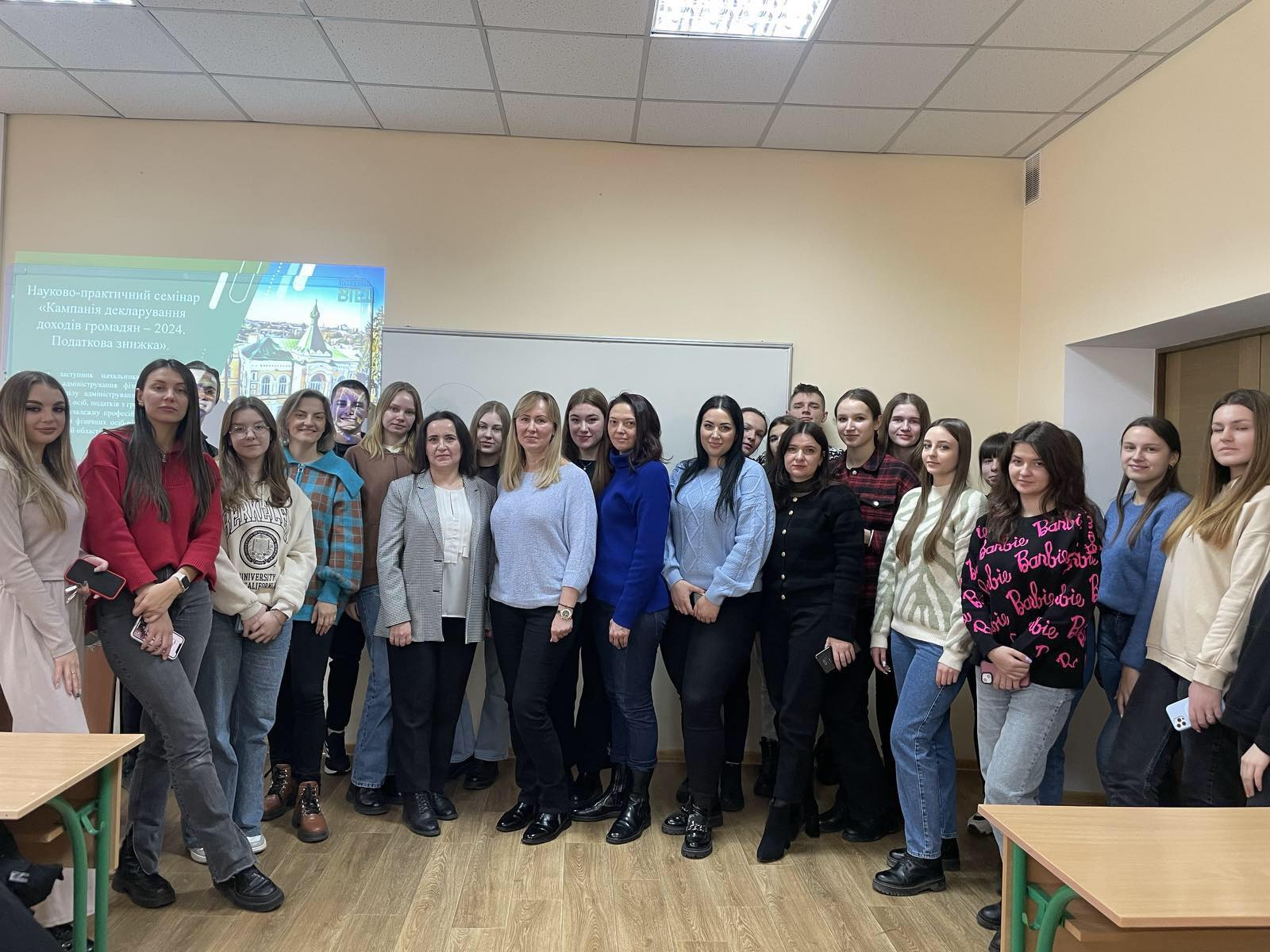 Спікер розповіла здобувачам вищої освіти про новації у декларуванні доходів громадян, особливості застосування податкової знижки, оподаткування грантів та інших набутих благ. Особливу зацікавленість у здобувачів вищої освіти викликала тема провадження підприємницької діяльності, яка є не зареєстрованою та методи відслідковування таких осіб.