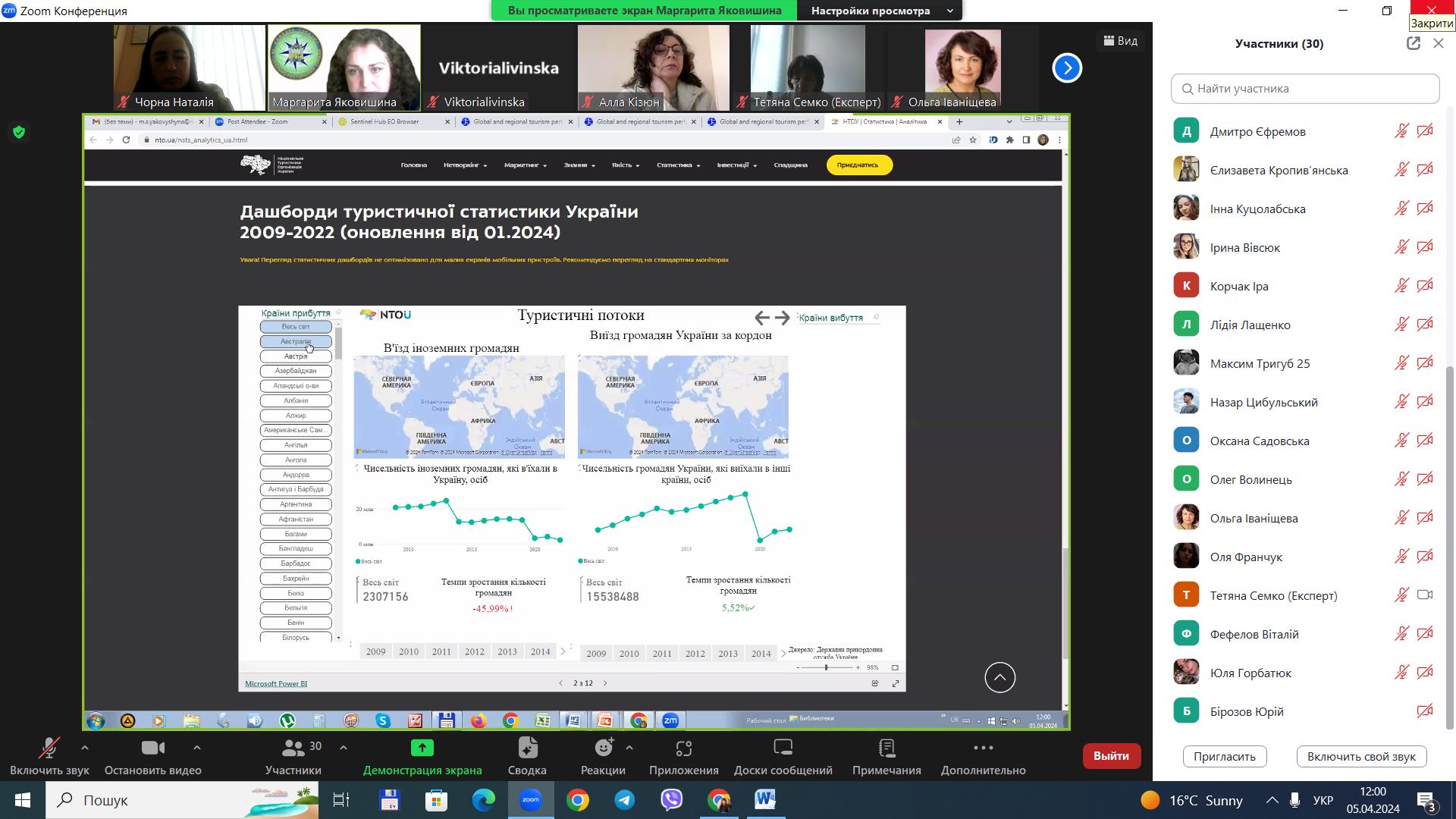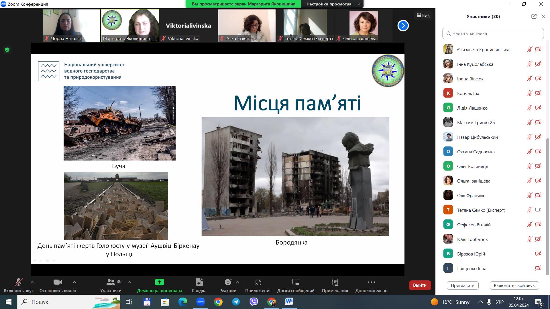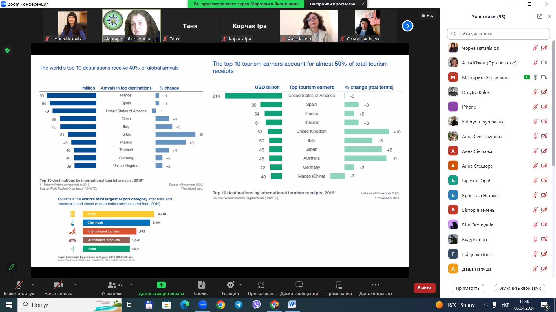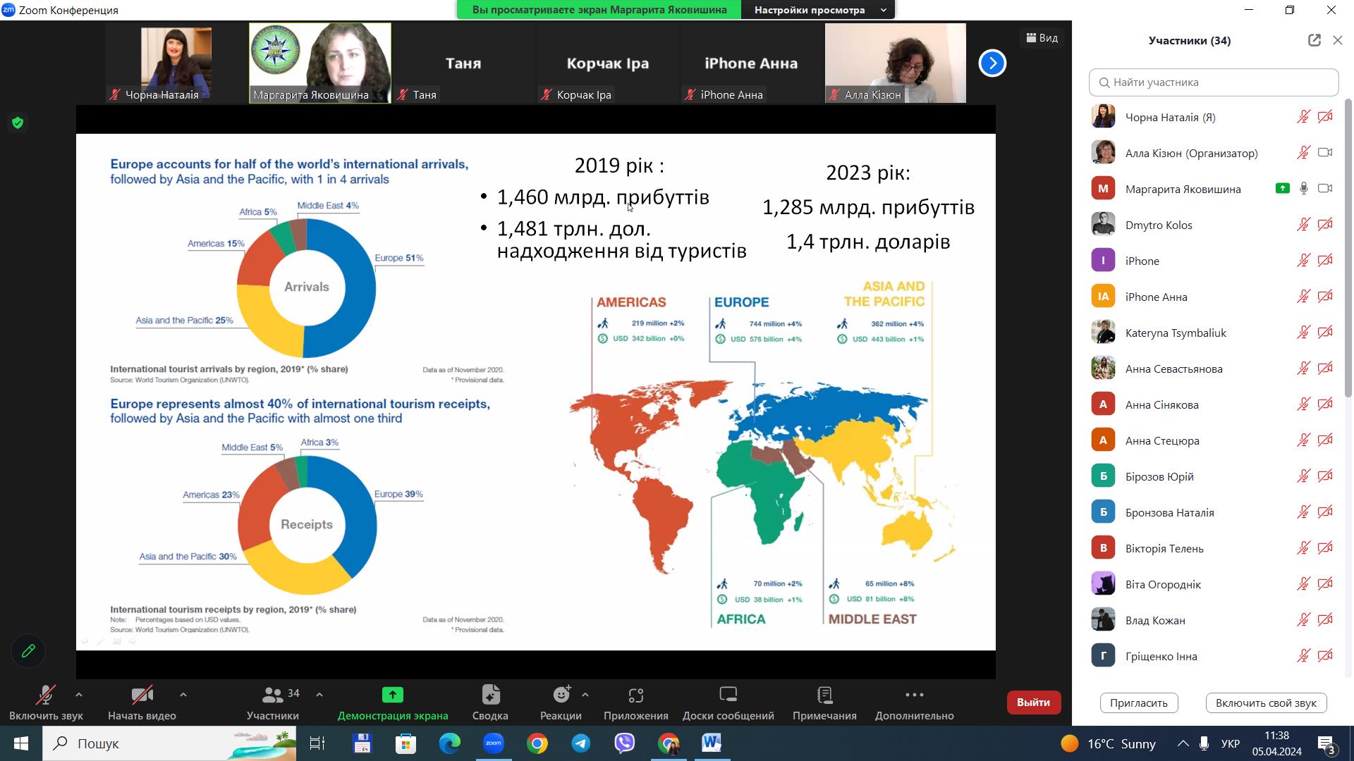 5 квітня 2024 року для здобувачів вищої освіти за спеціальністю 242 «Туризм» / «Туризм і рекреація» ОС «бакалавр», «магістр» у рамках вивчення освітніх компонентів «Міжнародний туризм», «Організація туризму» проведено гостьову лекцію на тему «Стан та перспективи міжнародного туризму в Україні», доповідачем на якій виступила старший викладач кафедри туризму та готельно-ресторанної справи Національного університету водного господарства та природокористування Маргарита Сергіївна Яковишина.