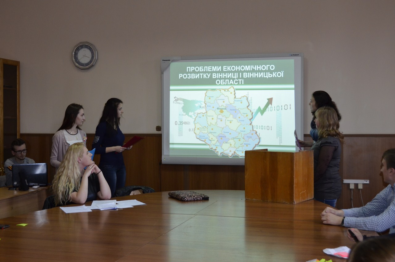 На початку засідання керівник гуртка Чорна Н.Ю. зазначила, що на сьогоднішній день тема економічного розвитку Вінницької області є надзвичайно актуальною. Були представлені презентації з данної теми, а саме: студентів Коритко Дарії (ДФК-31), Басок Катерини (ДФК-31), Гуменюк Лілії (ДФК-31), Грицини Римми (ДФК-31), Джерелюк Дарії (ДФК-31), Висловського Миколи (ДФК-31), Барчака Ігоря (ЕК-31), Мельничук Марії (МО-11), Яремко Анастасії (МО-11). Загалом підсумком засідання є результативна та згуртована робота команд за участю студентів різних факультетів, ми дійшли висновку, що Вінницька область є однією з найбільш економічно розвинених областей України, але, виходячи з нинішньої політичної ситуації та економічної кризи, економічний стан Вінницької області залишає бажати кращого і нам є, власне, до чого прагнути, аби зробити наше місто дійсно європейським. На засіданні студентами було запропоновано проявити волонтерський дух, а саме в дні Великодня, ми вирішили підтримати наших воїнів, які постраждали в зоні АТО, відвіданням військового шпиталю.