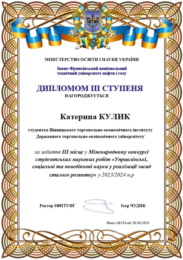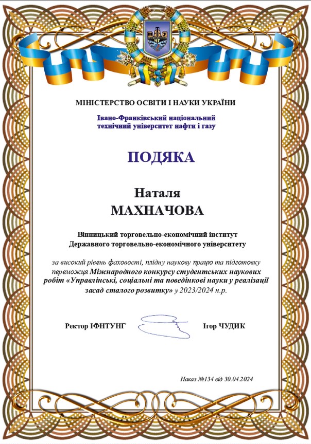 Перемога в Міжнародному конкурсі студентських наукових робіт «Управлінські, соціальні та поведінкові науки у реалізації засад сталого розвитку»
