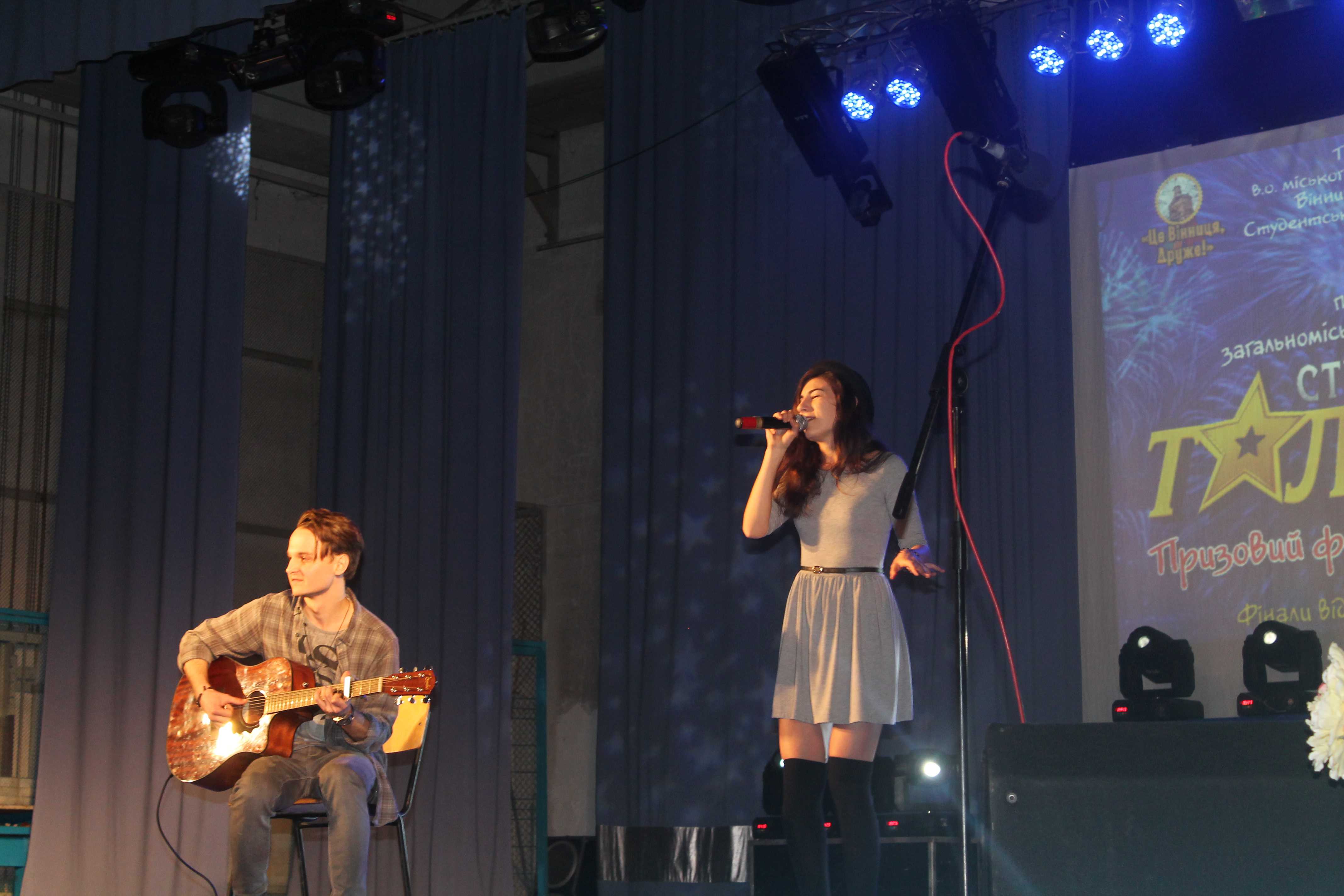 Вінницький торговельно-економічний інститут цього року представляв дует «The Frisson»: володарка чудодійного голосу – Ліля Якубовська, яка є студенткою факультету товарознавства, туризму та готельно-ресторанної справи та віртуозний гітарист Влад Сівак – студент факультету економіки, маркетингу та менеджменту. «The Frisson» став володарем ІІ місця, хоча для нас вони – переможці. На конкурсі було представлено дуетом попурі на теми сучасних іноземних хітів, яким з першого акорду Ліля та Влад заполонили енергетикою всю глядацьку залу. Також поза конкурсом з танцювальною композицією «Фольк» виступав і театр сучасного танцю «Ритм серця», яким керує Марина Висоцька. Директор інституту та вся адміністрація ВТЕІ КНТЕУ привітали наших талановитих конкурсантів з занятим призовим місцем у фіналі конкурсу «Студенти мають таланти». Бажаємо успіхів і творчих злетів нашим талановитим студентам і надалі, прославляючи свій рідний інститут.